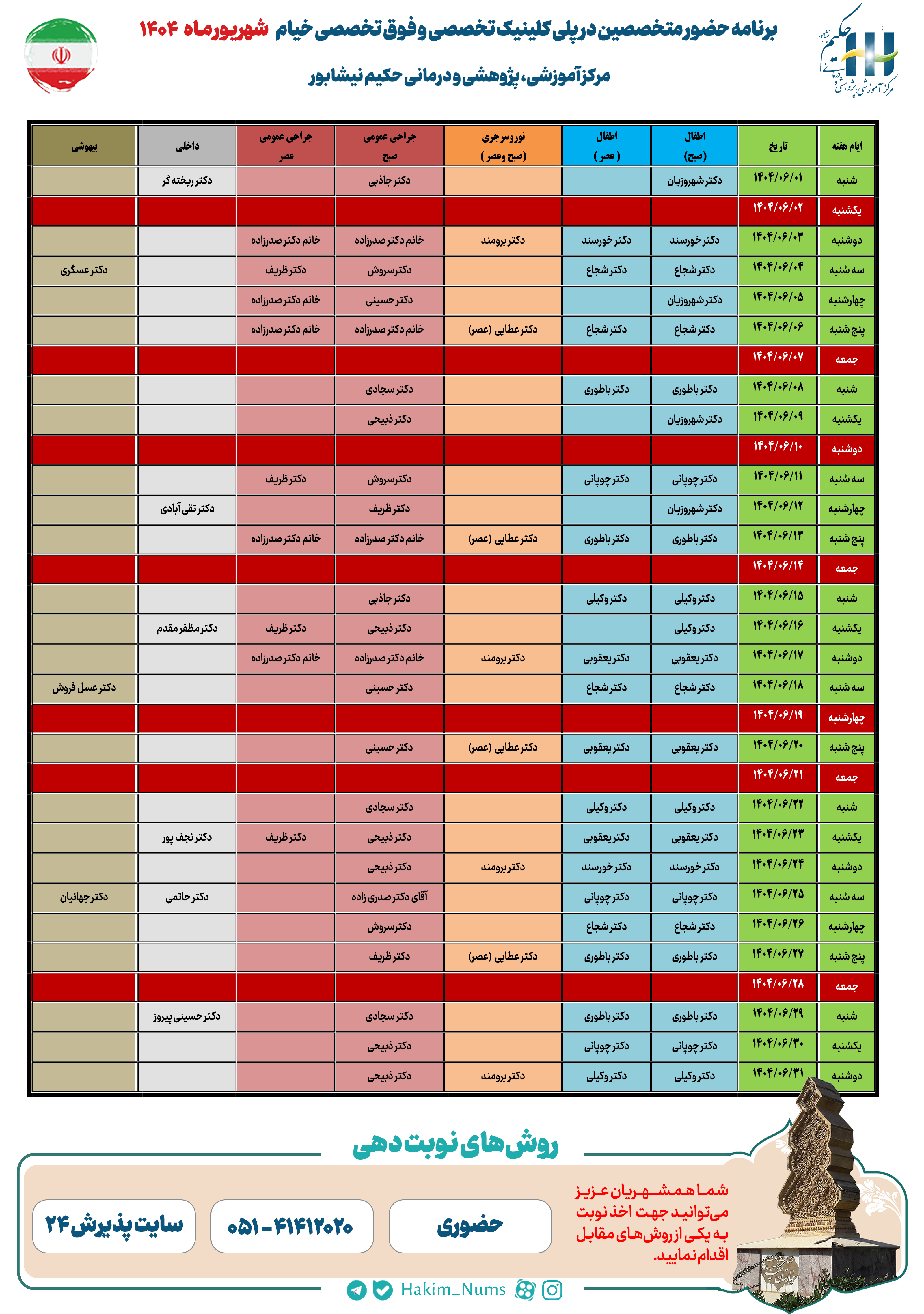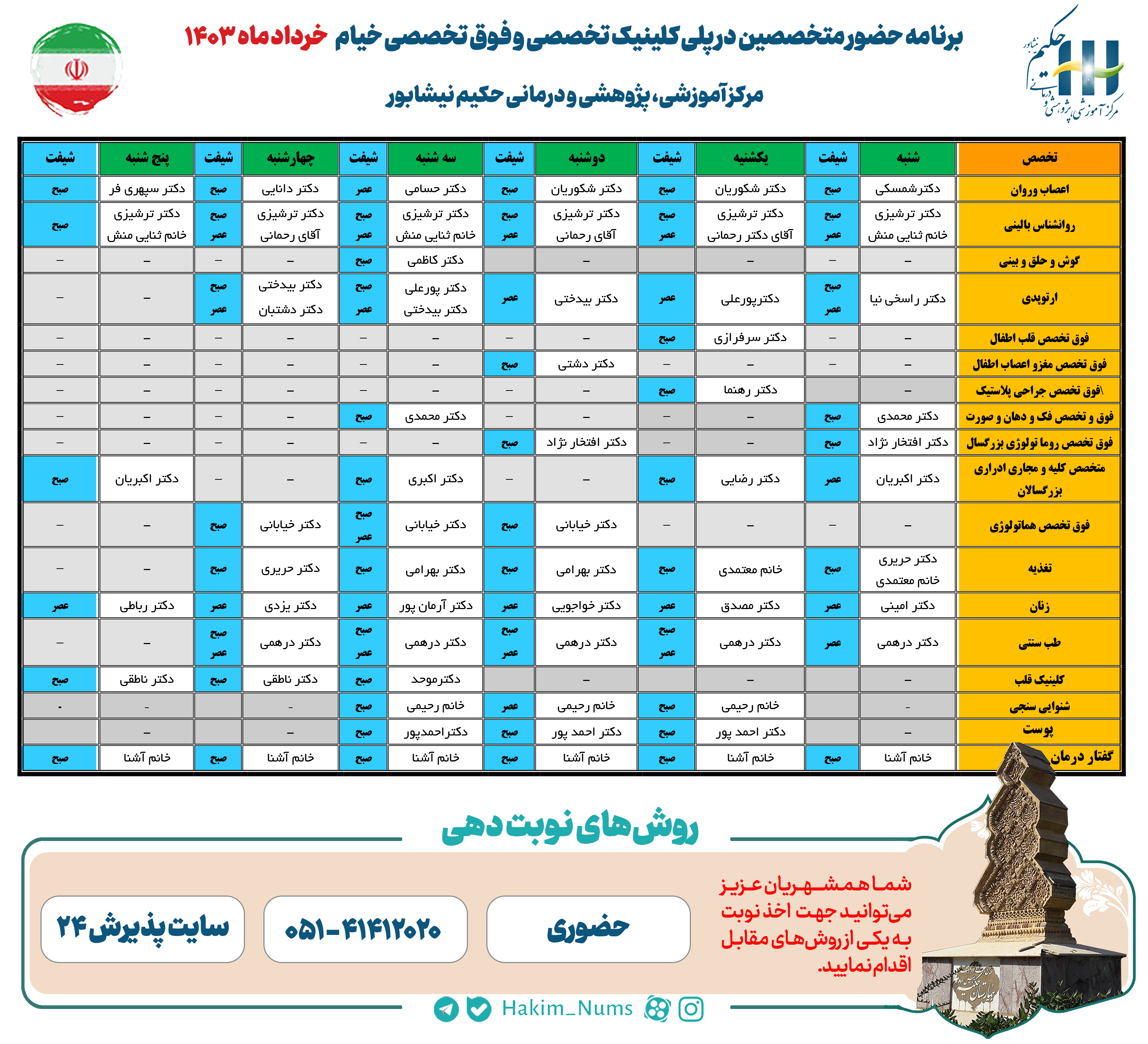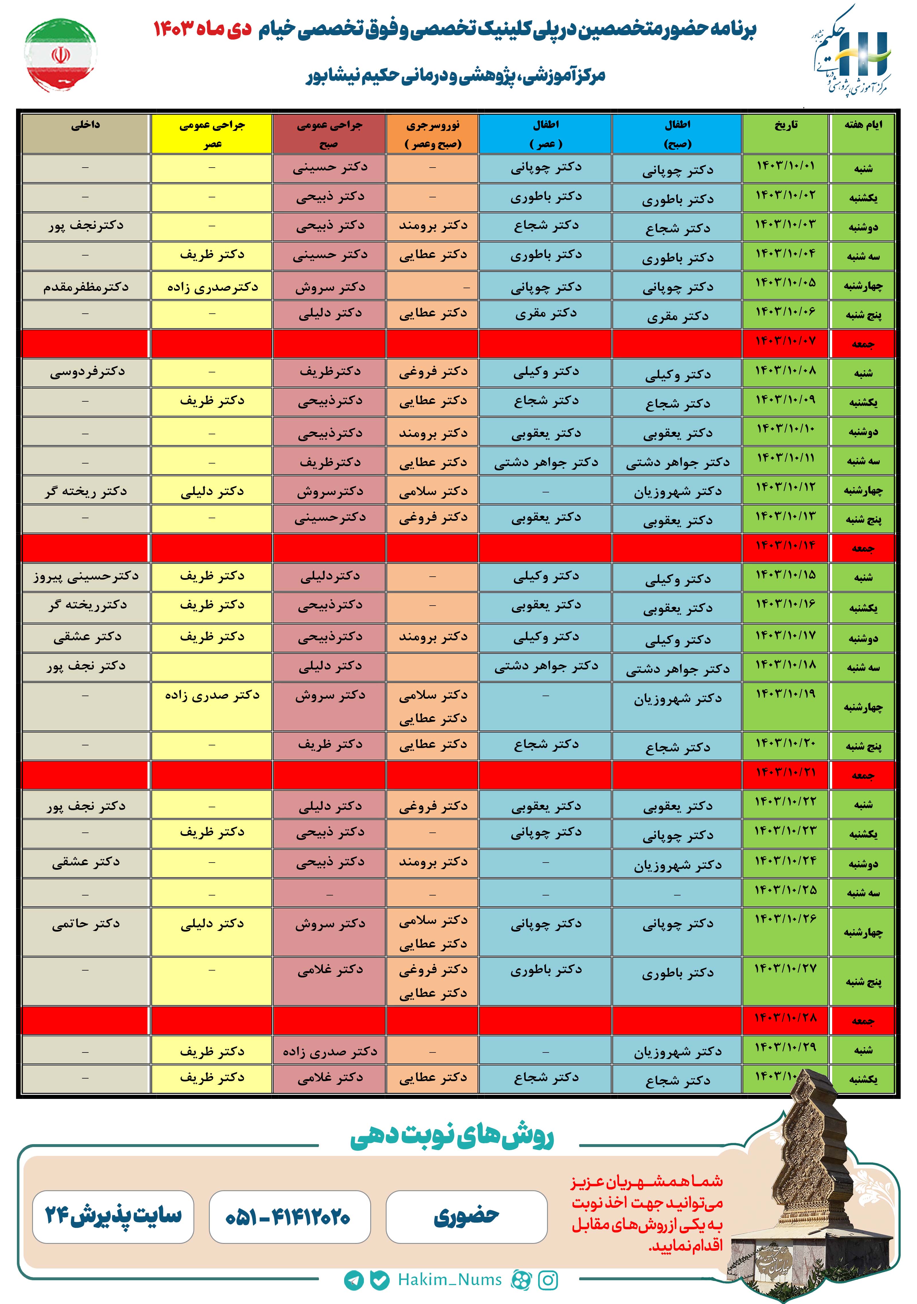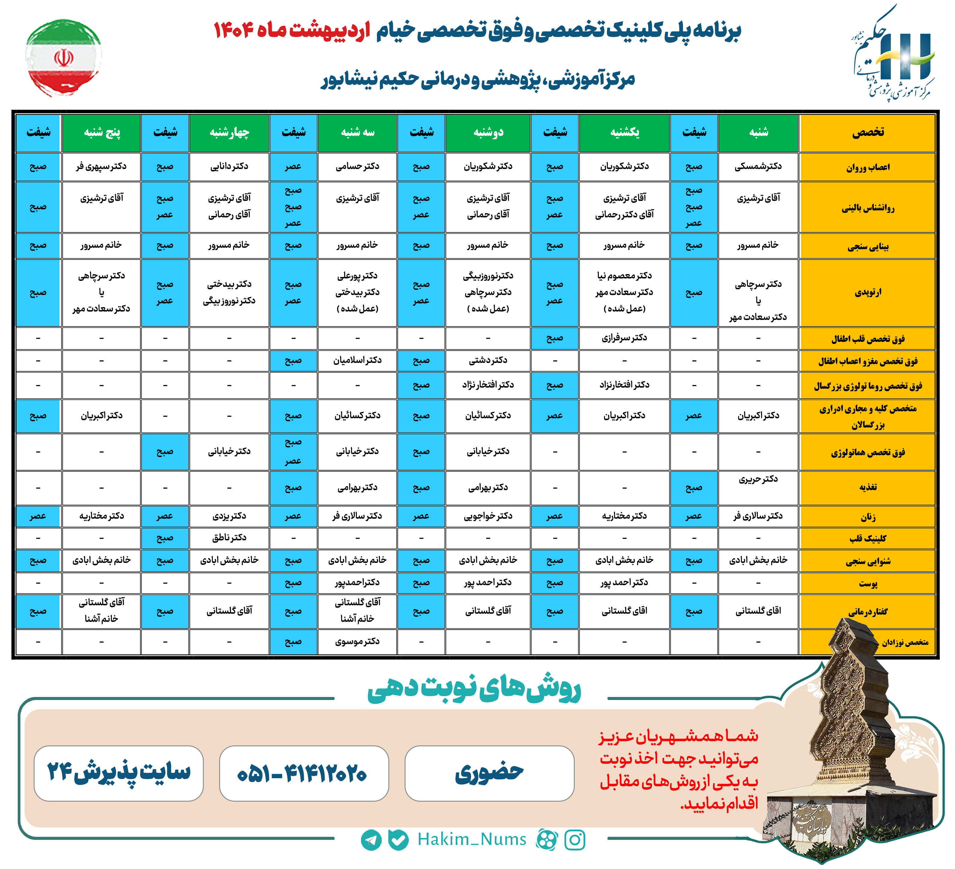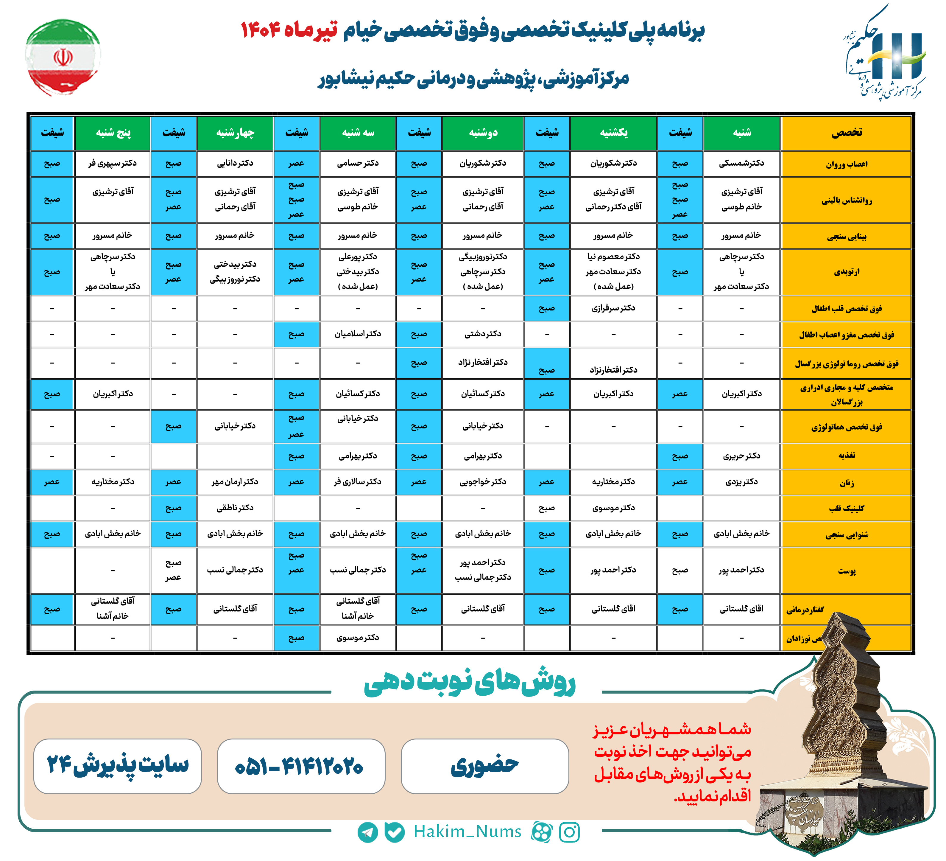 برنامه حضور متخصصین در درمانگاه تخصصی و فوق تخصصی خیام و مرکز پزشکی شمس شرق