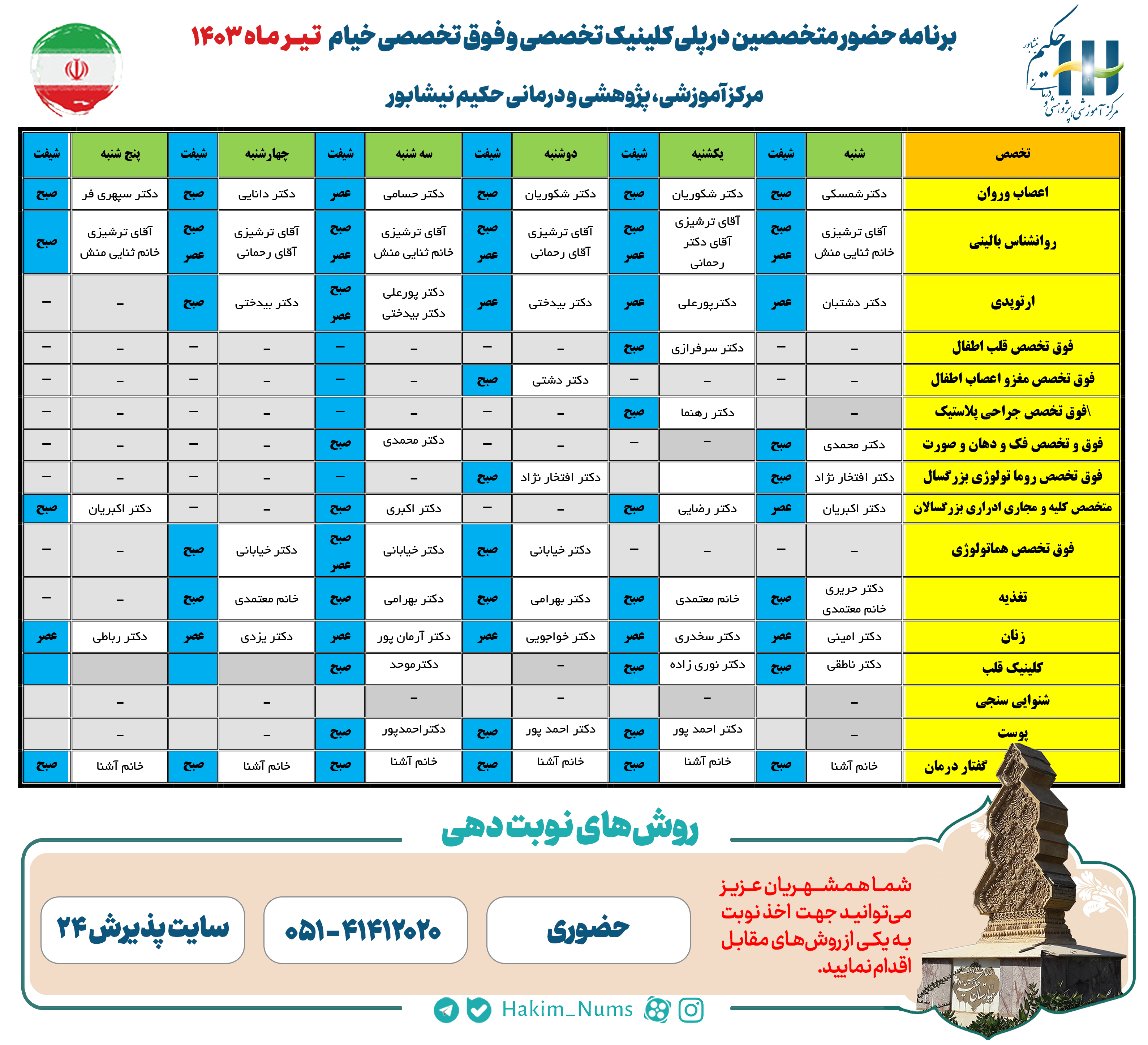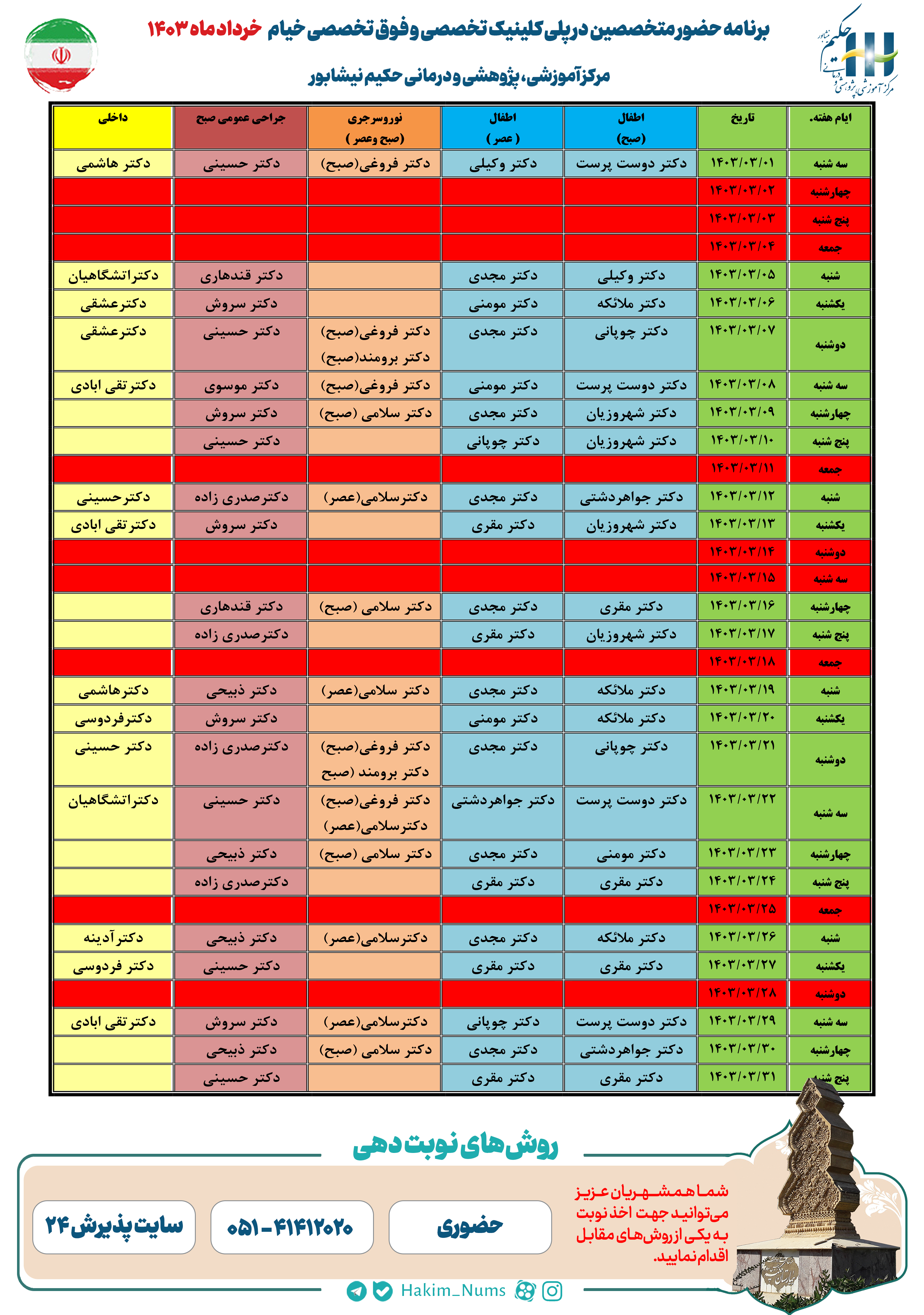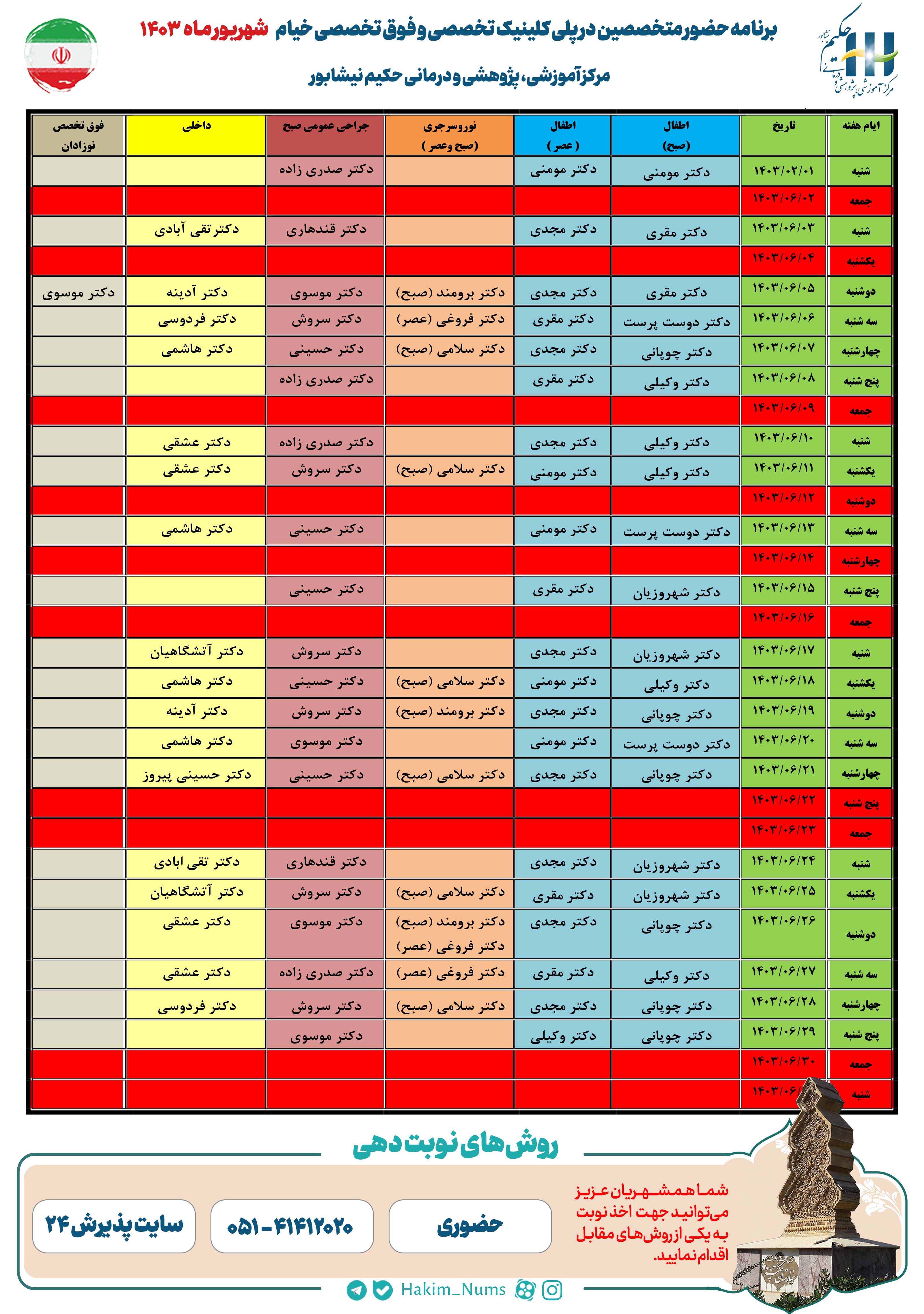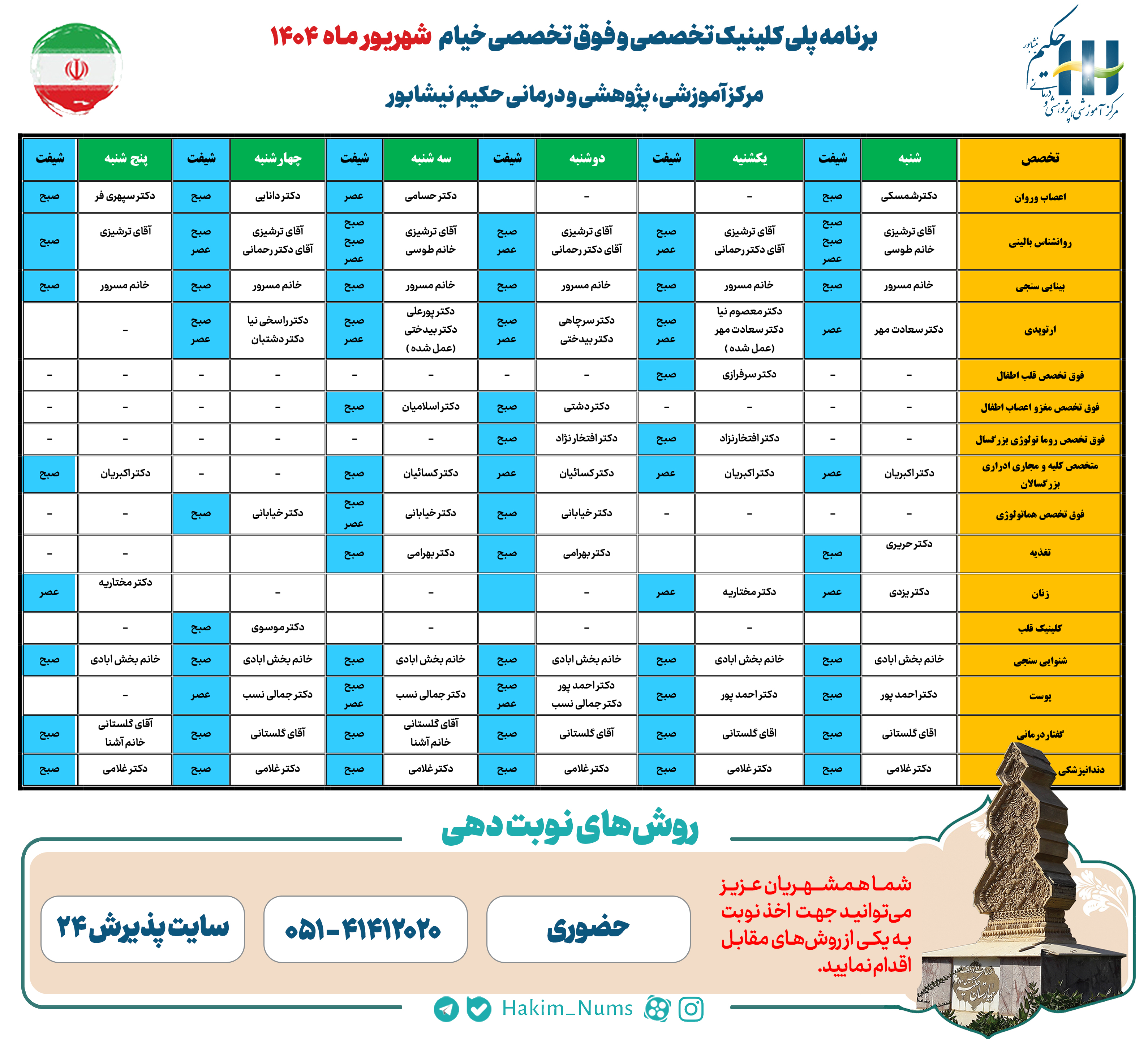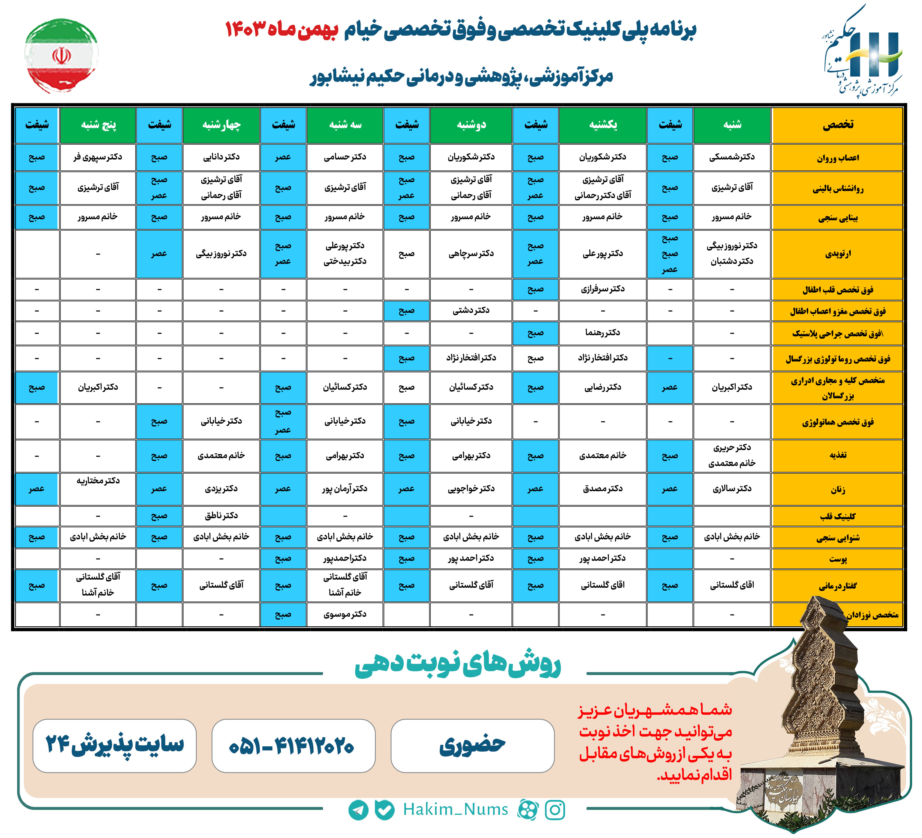 برنامه حضور متخصصین در درمانگاه تخصصی و فوق تخصصی خیام و مرکز پزشکی شمس شرق