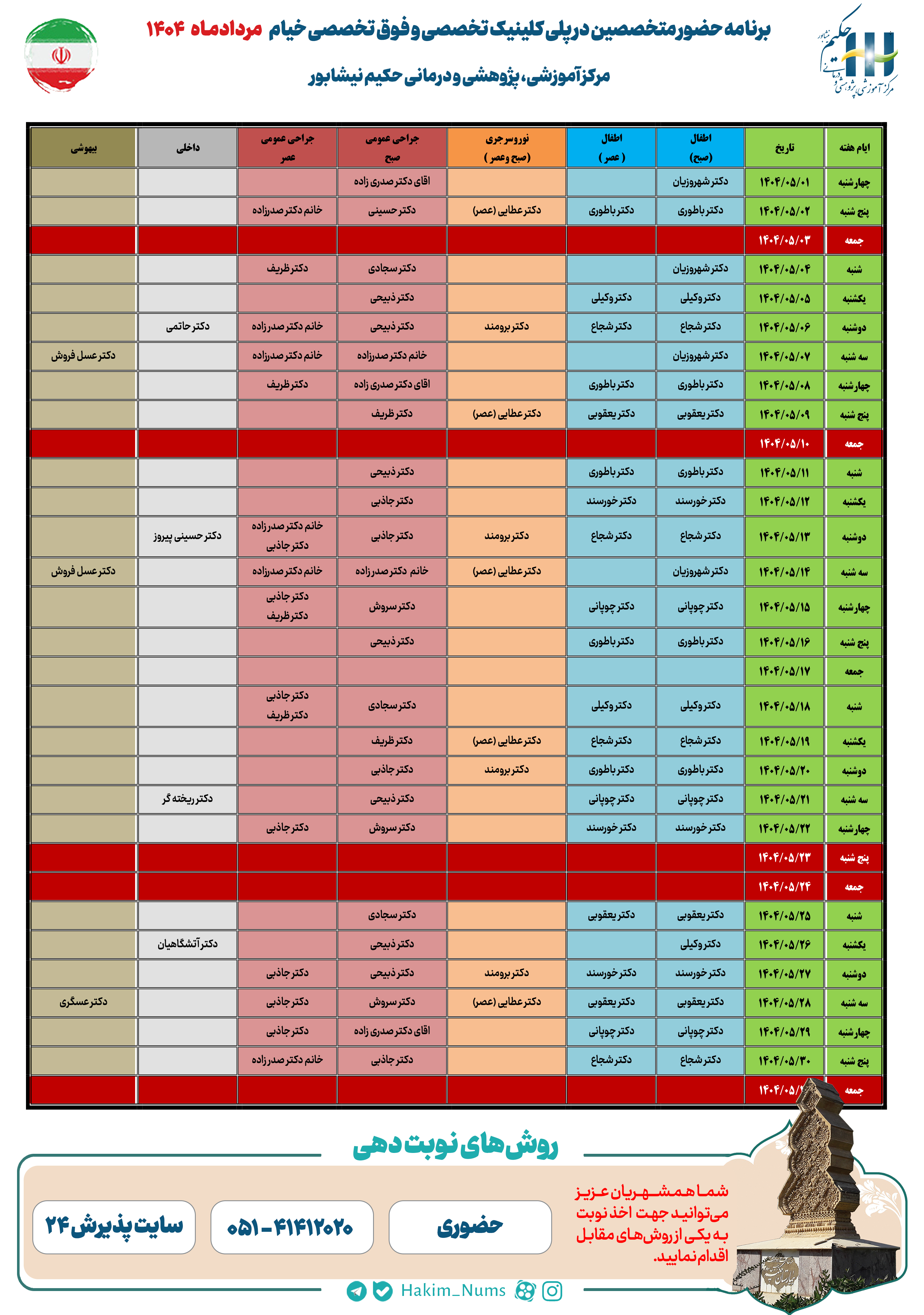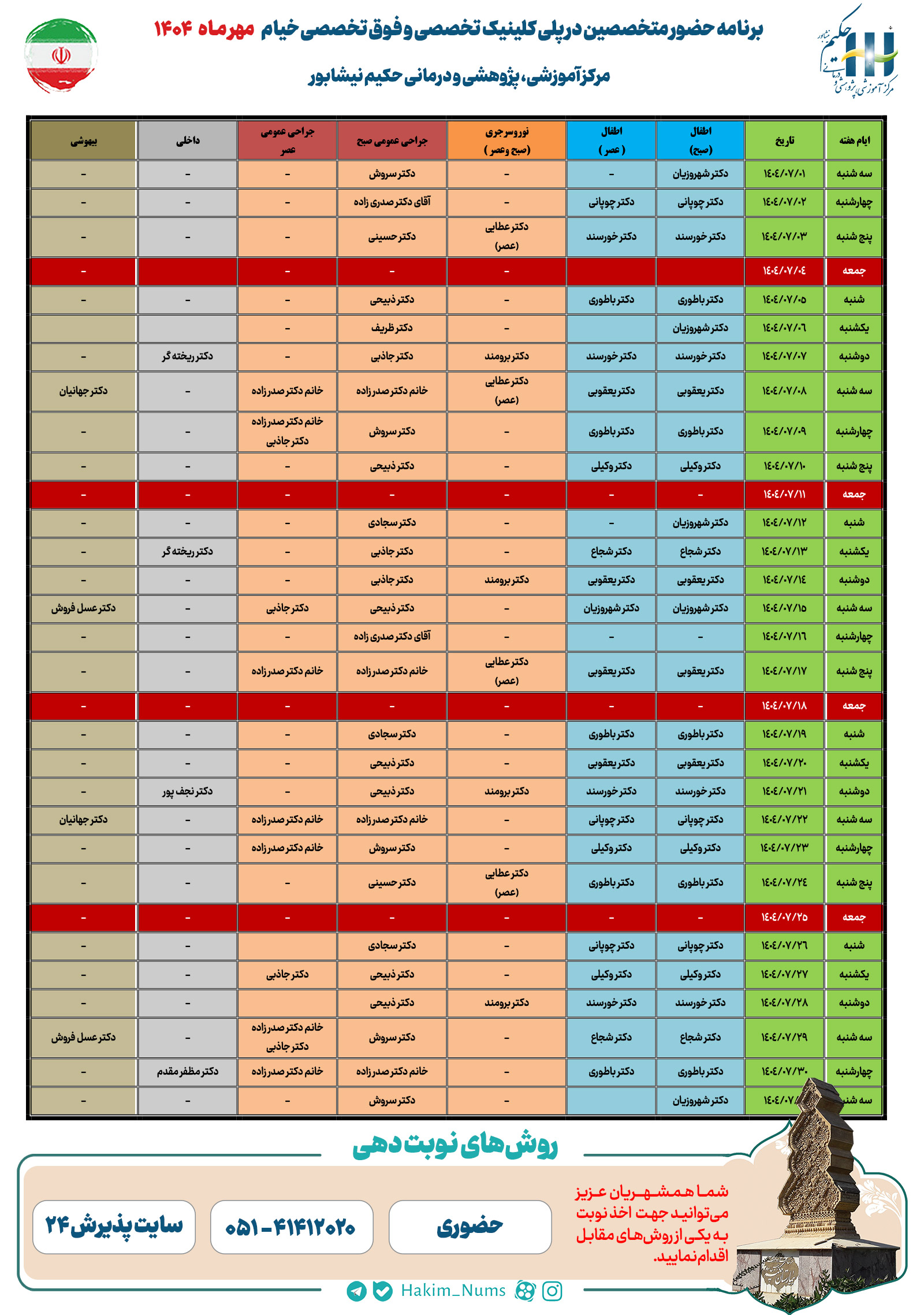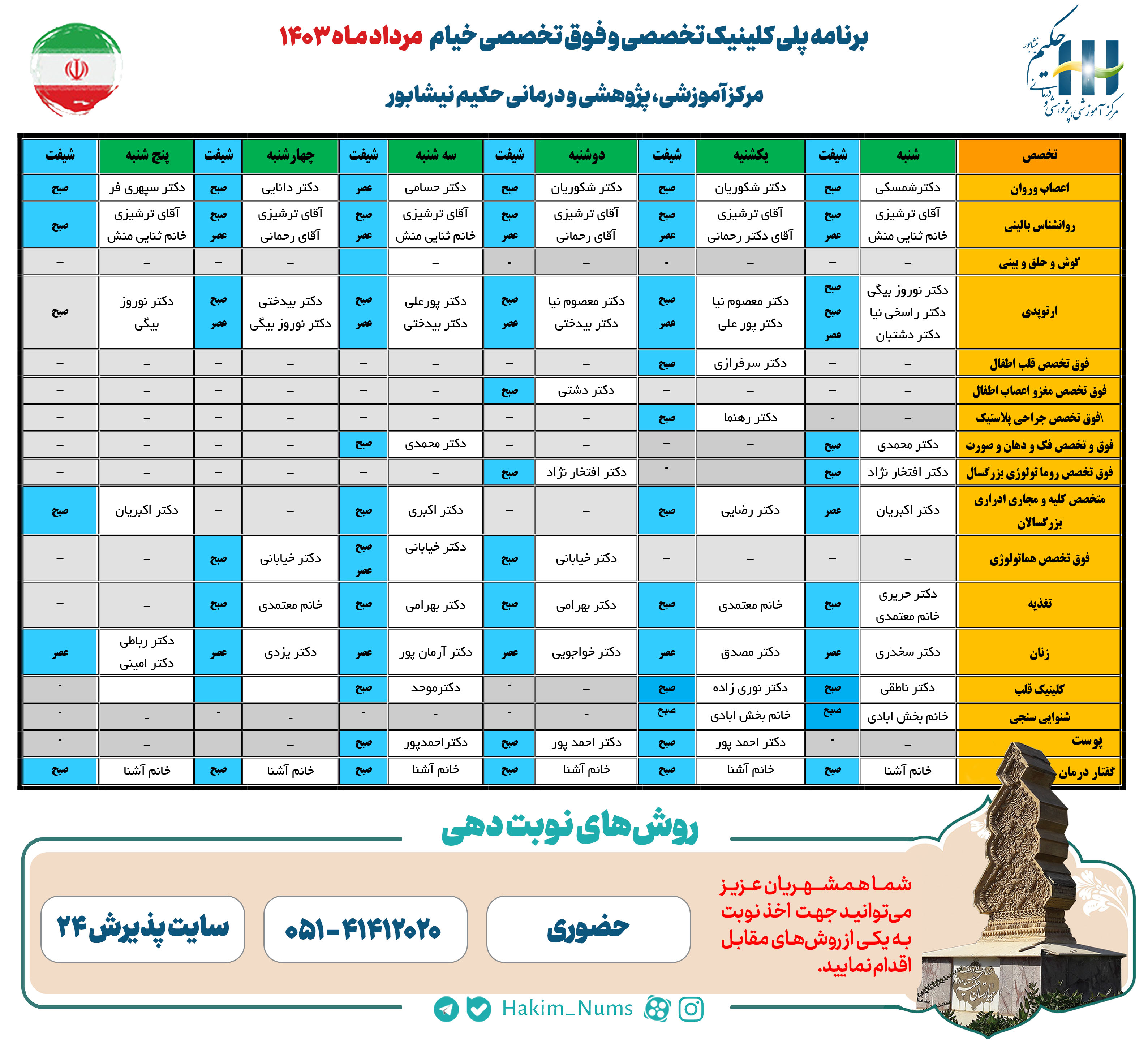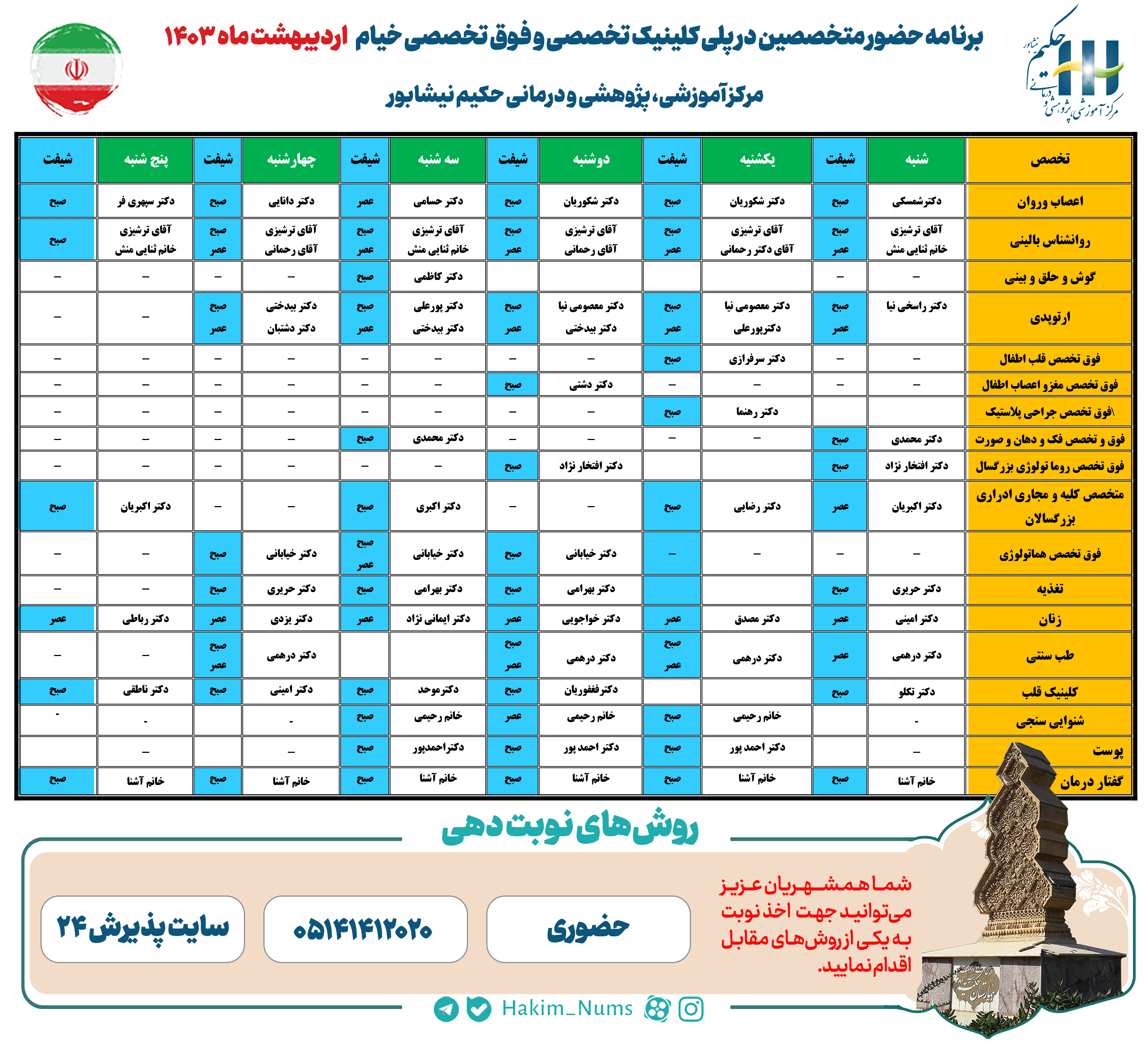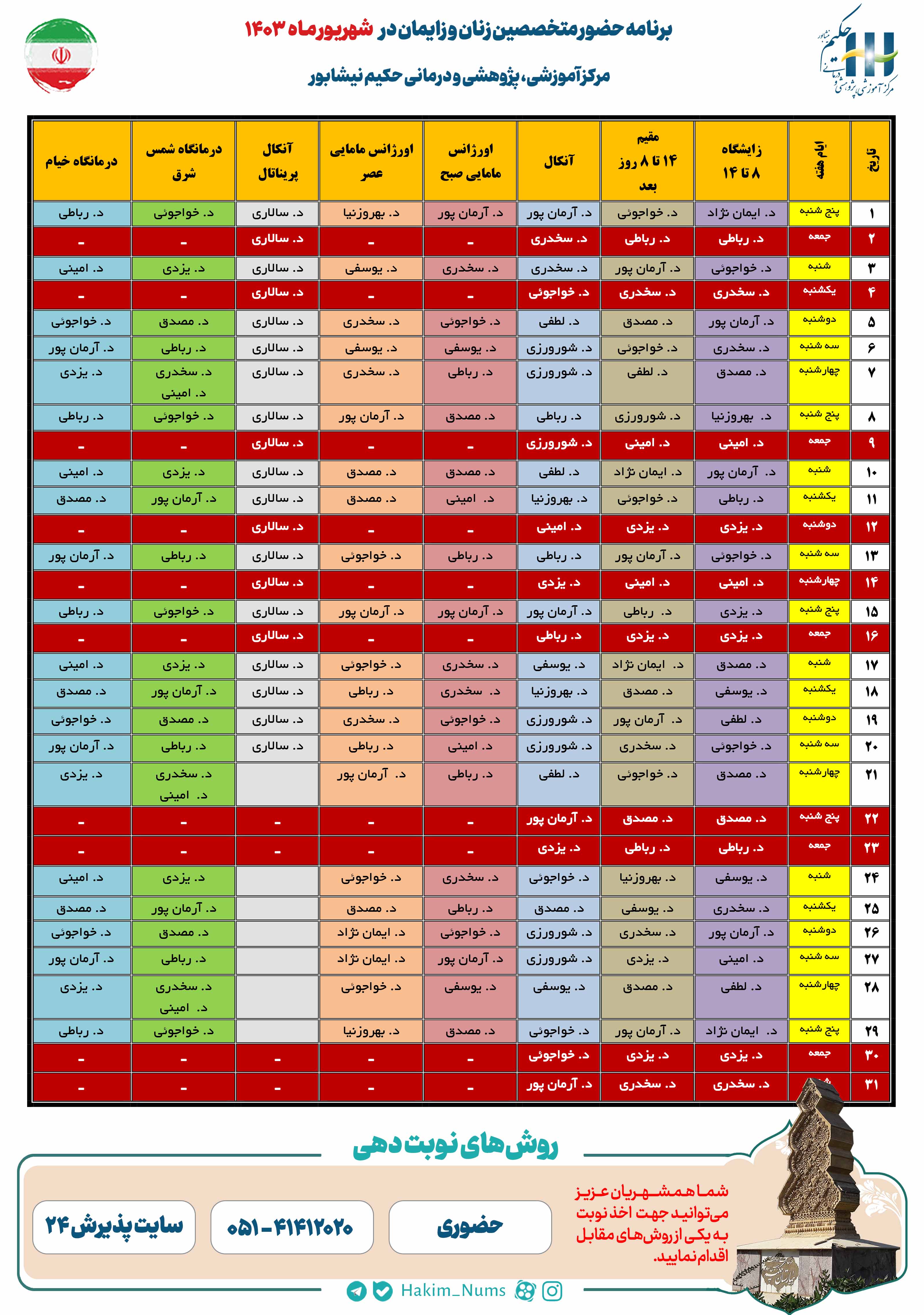برنامه حضور متخصصین در درمانگاه تخصصی و فوق تخصصی خیام و مرکز پزشکی شمس شرق