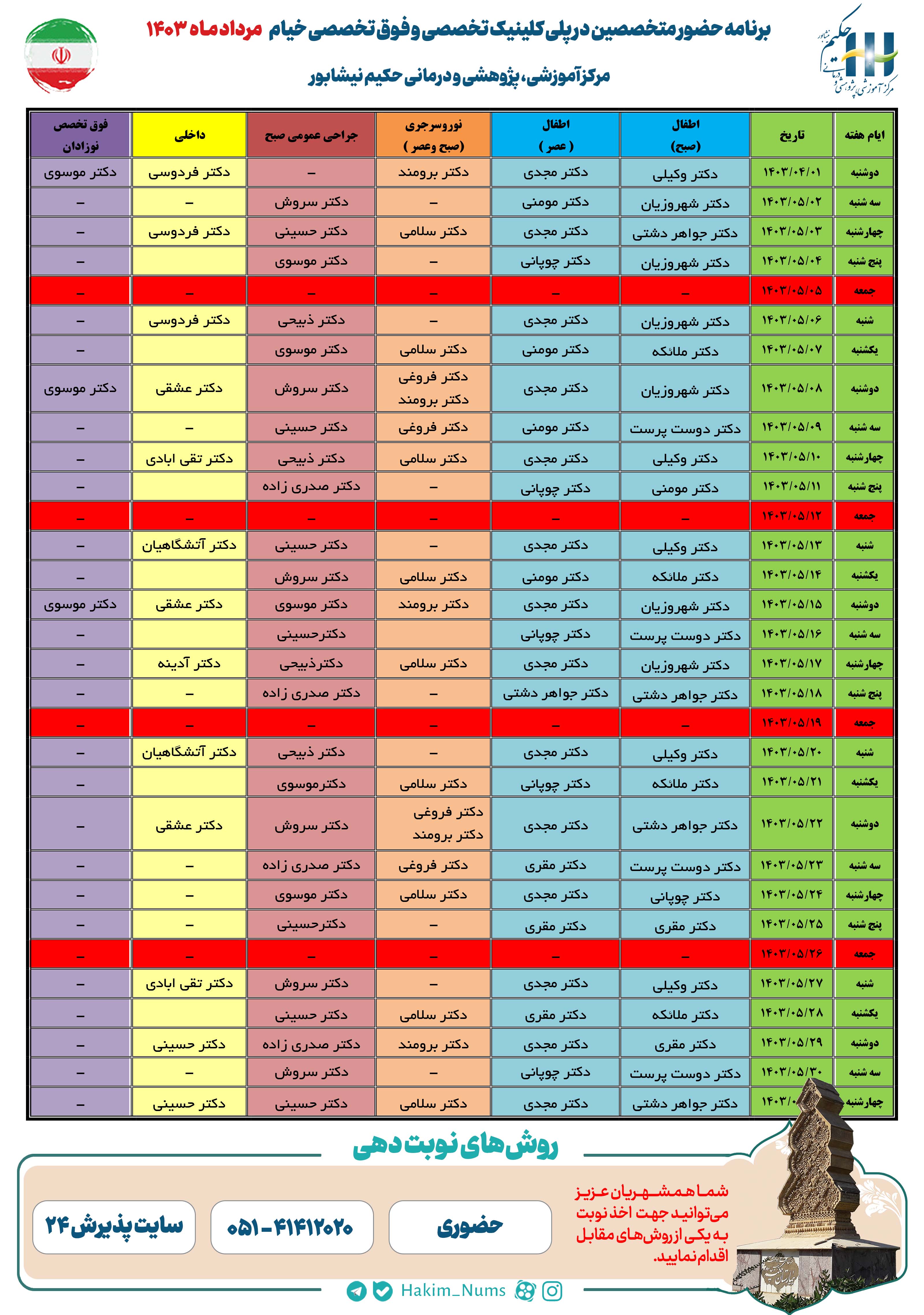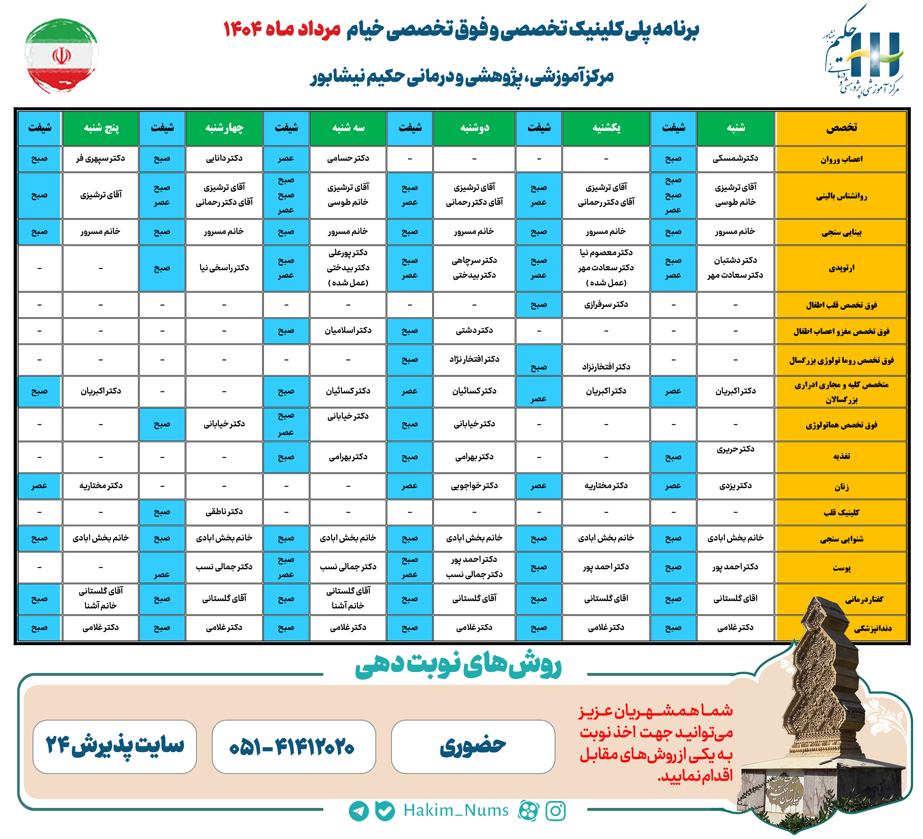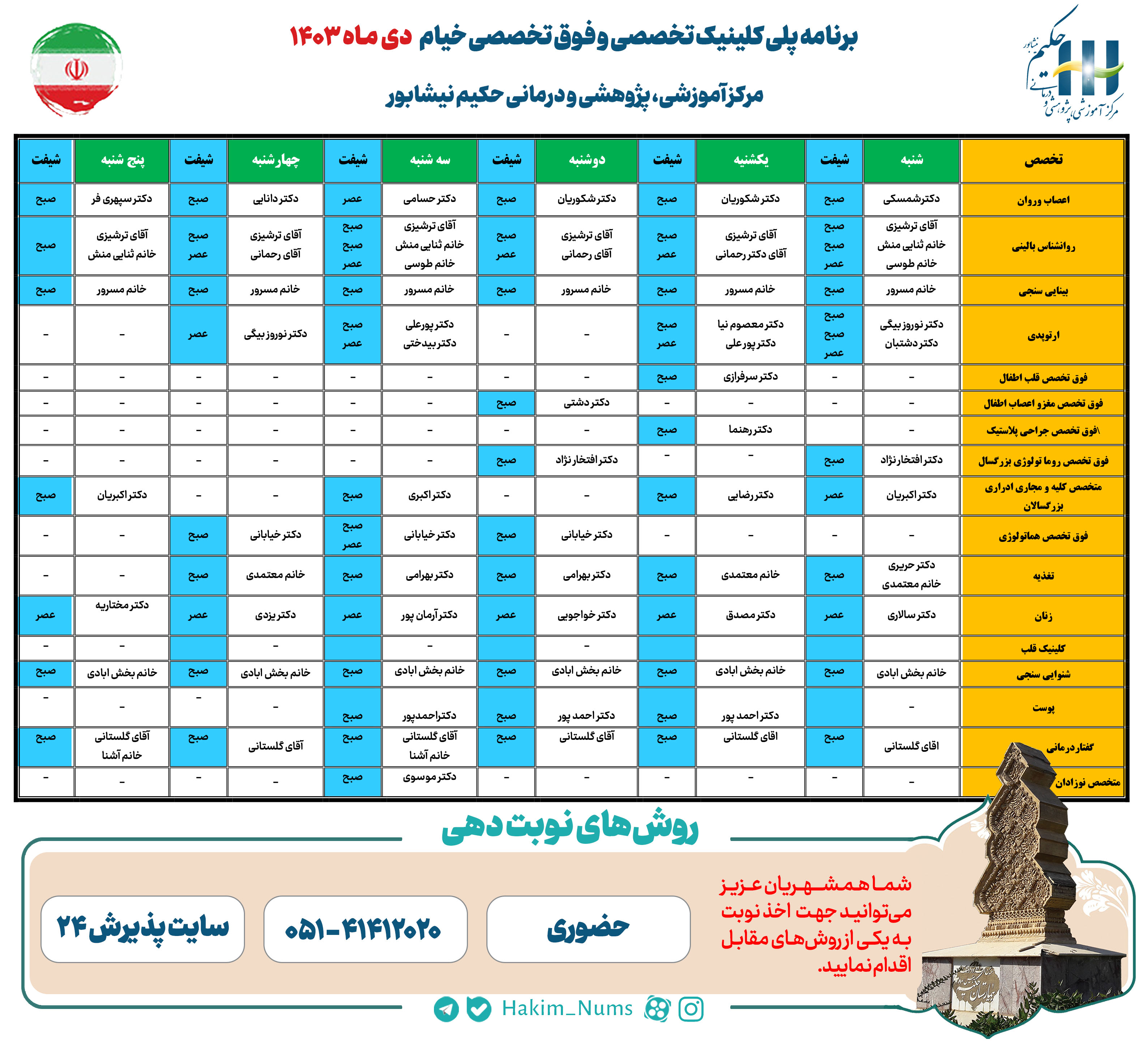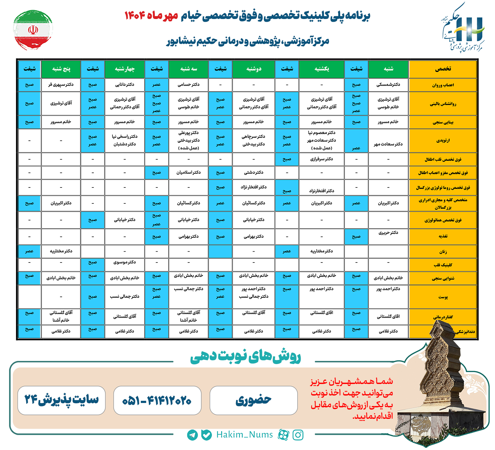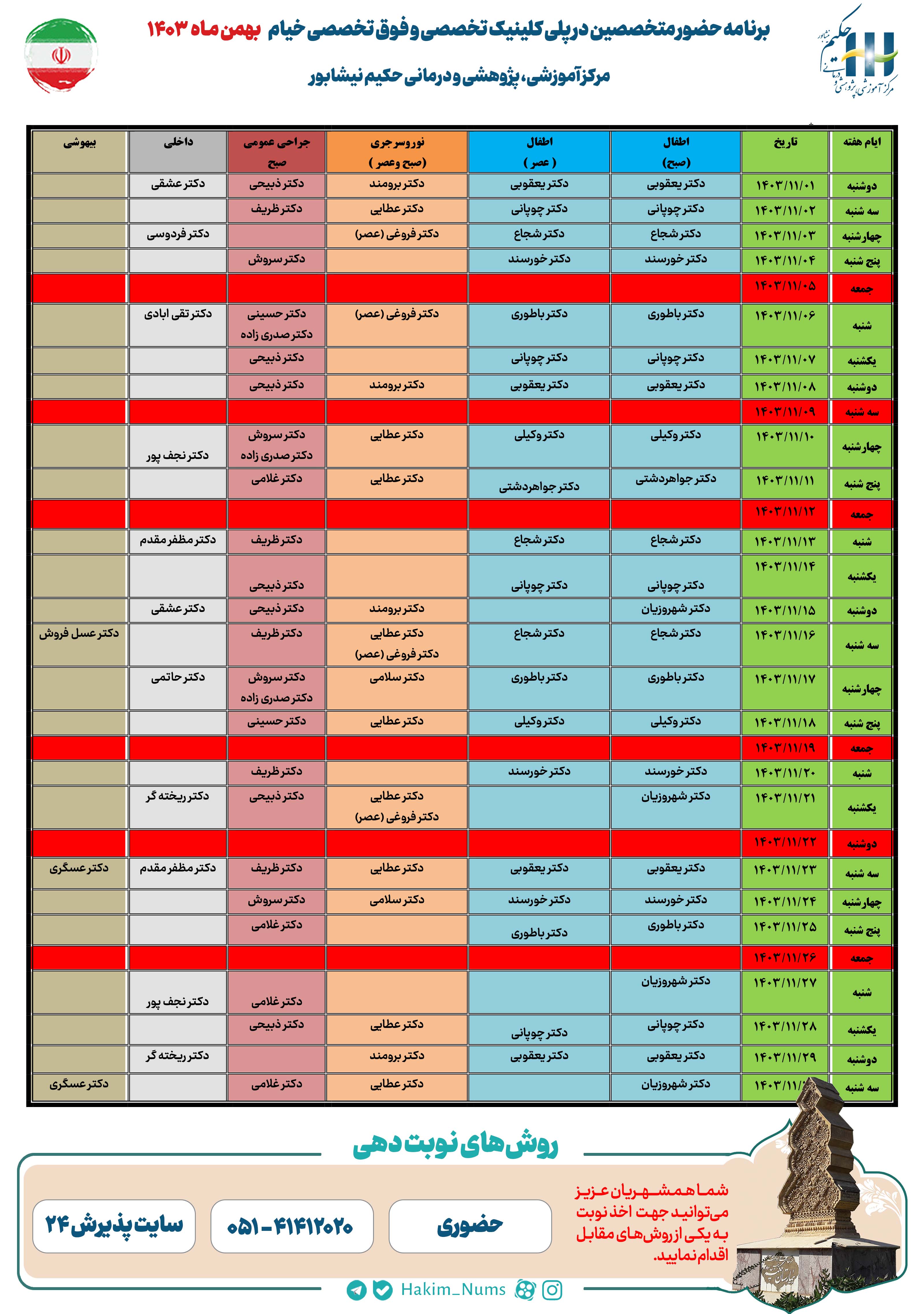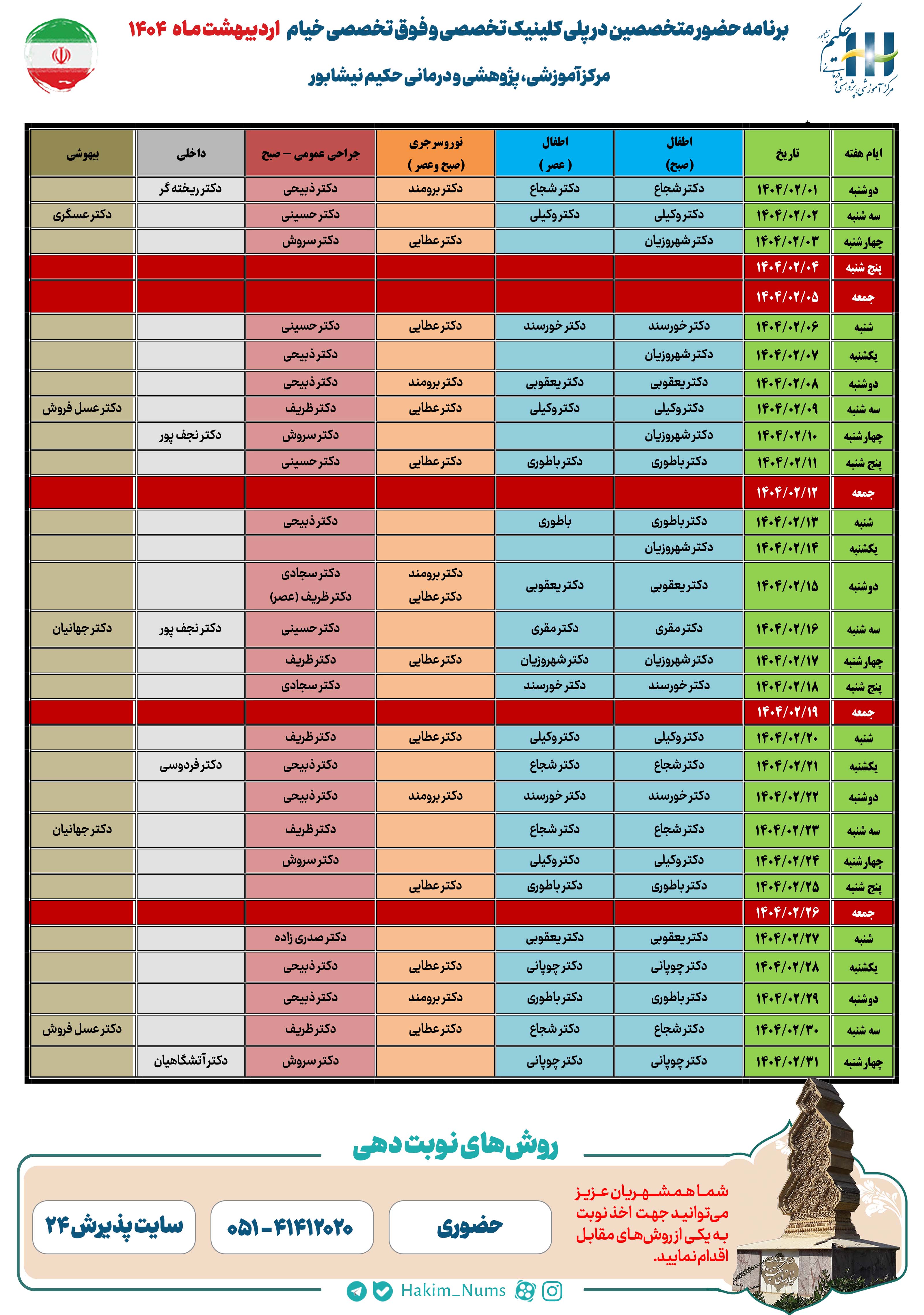 برنامه حضور متخصصین در درمانگاه تخصصی و فوق تخصصی خیام و مرکز پزشکی شمس شرق