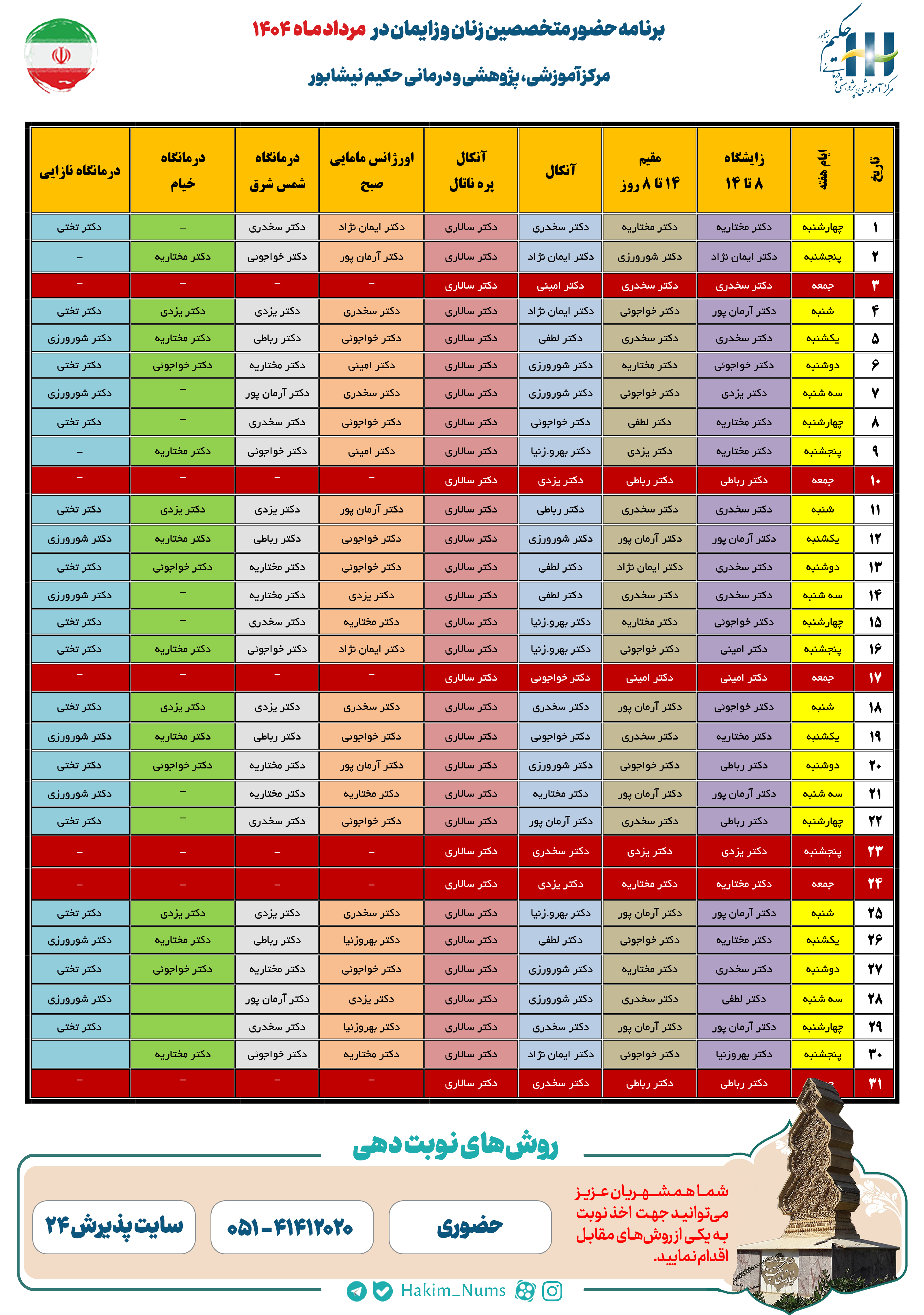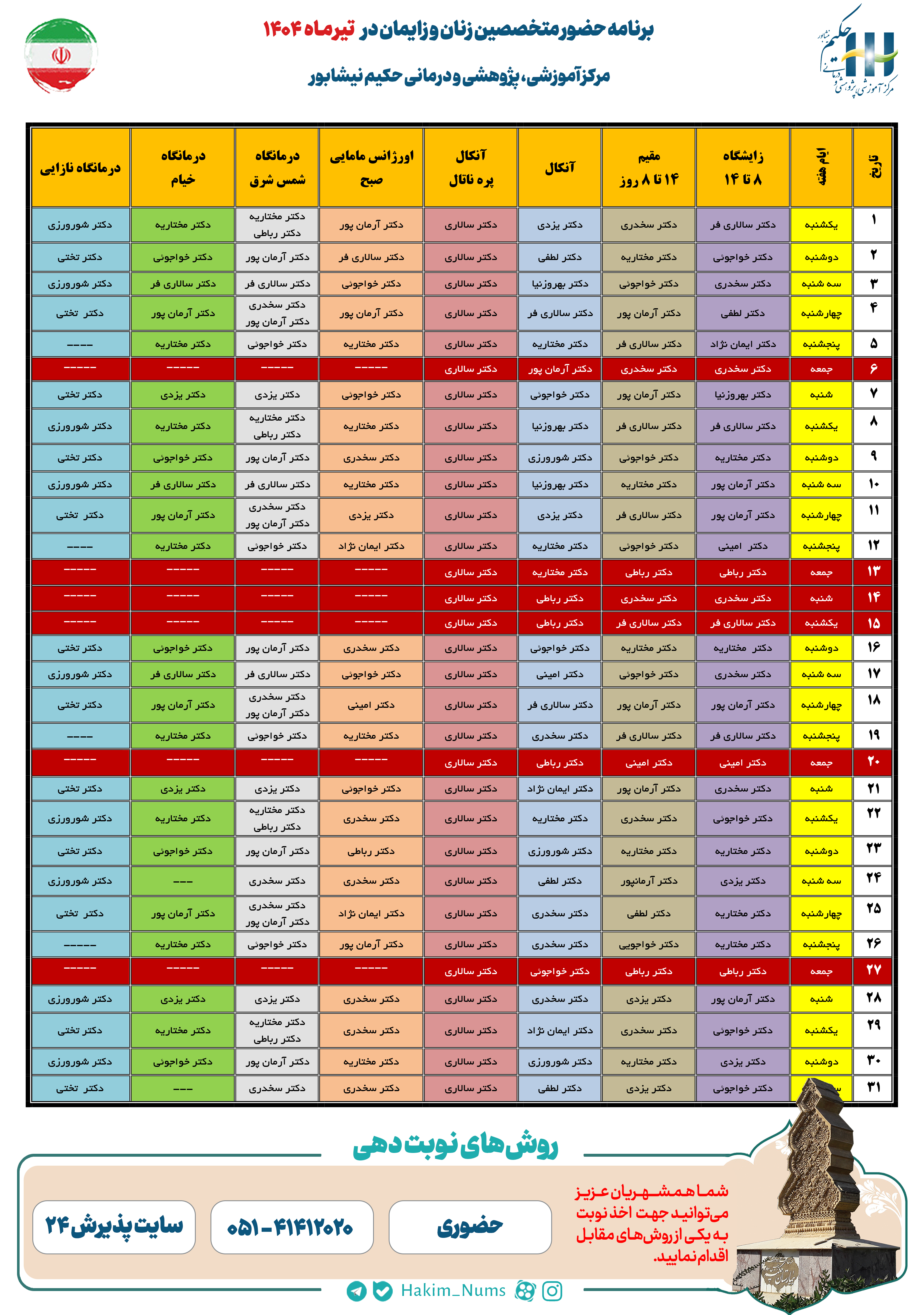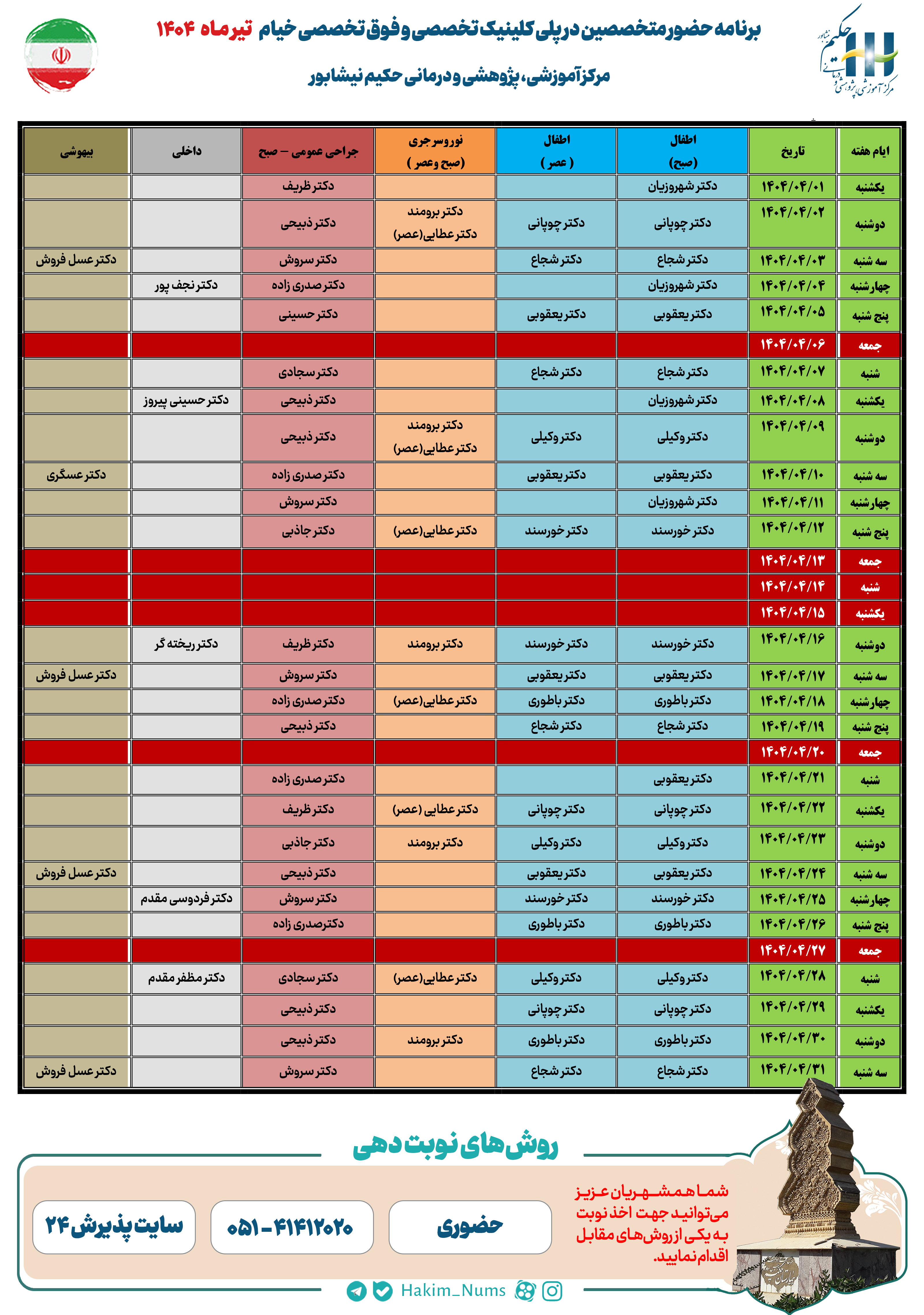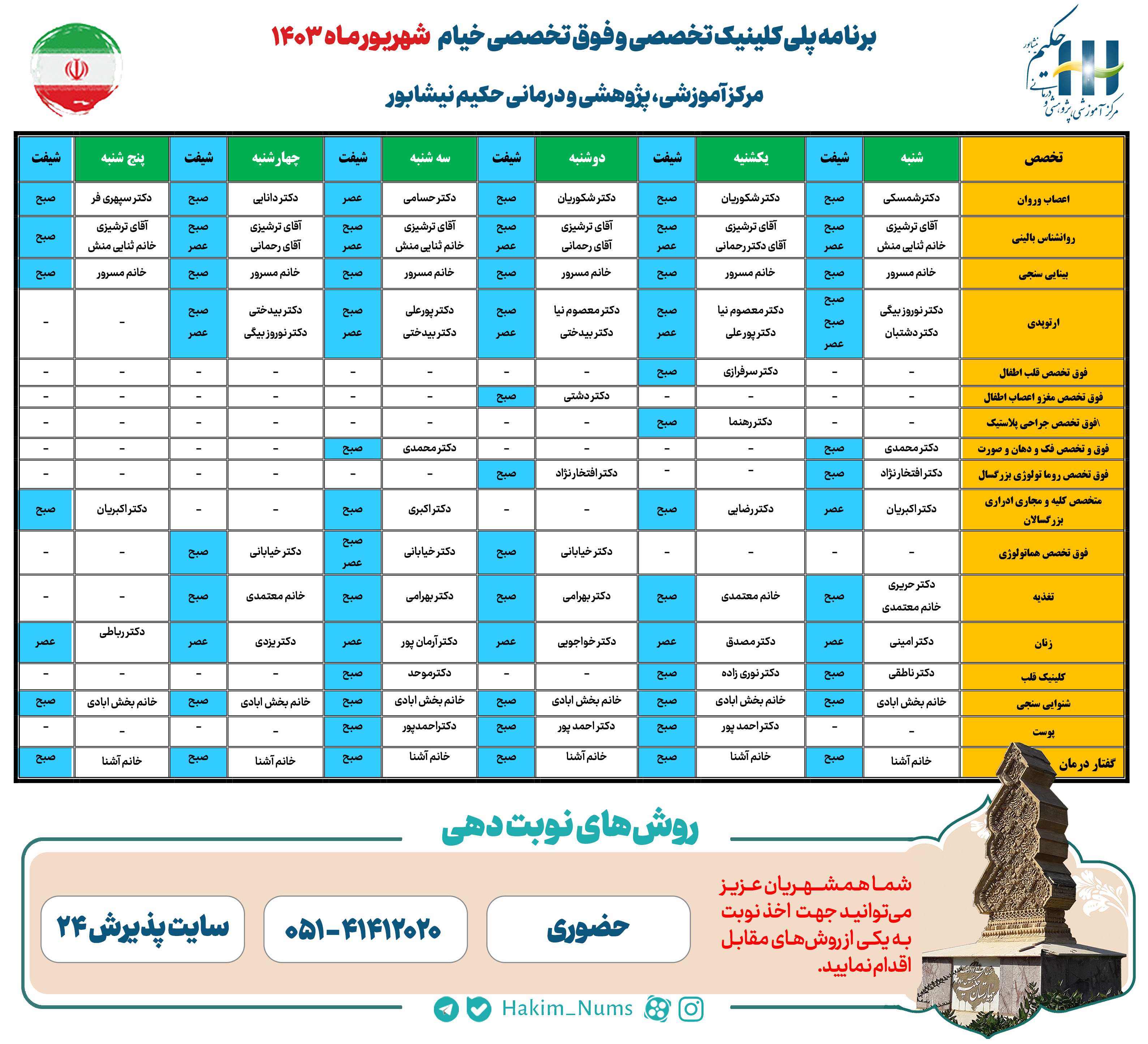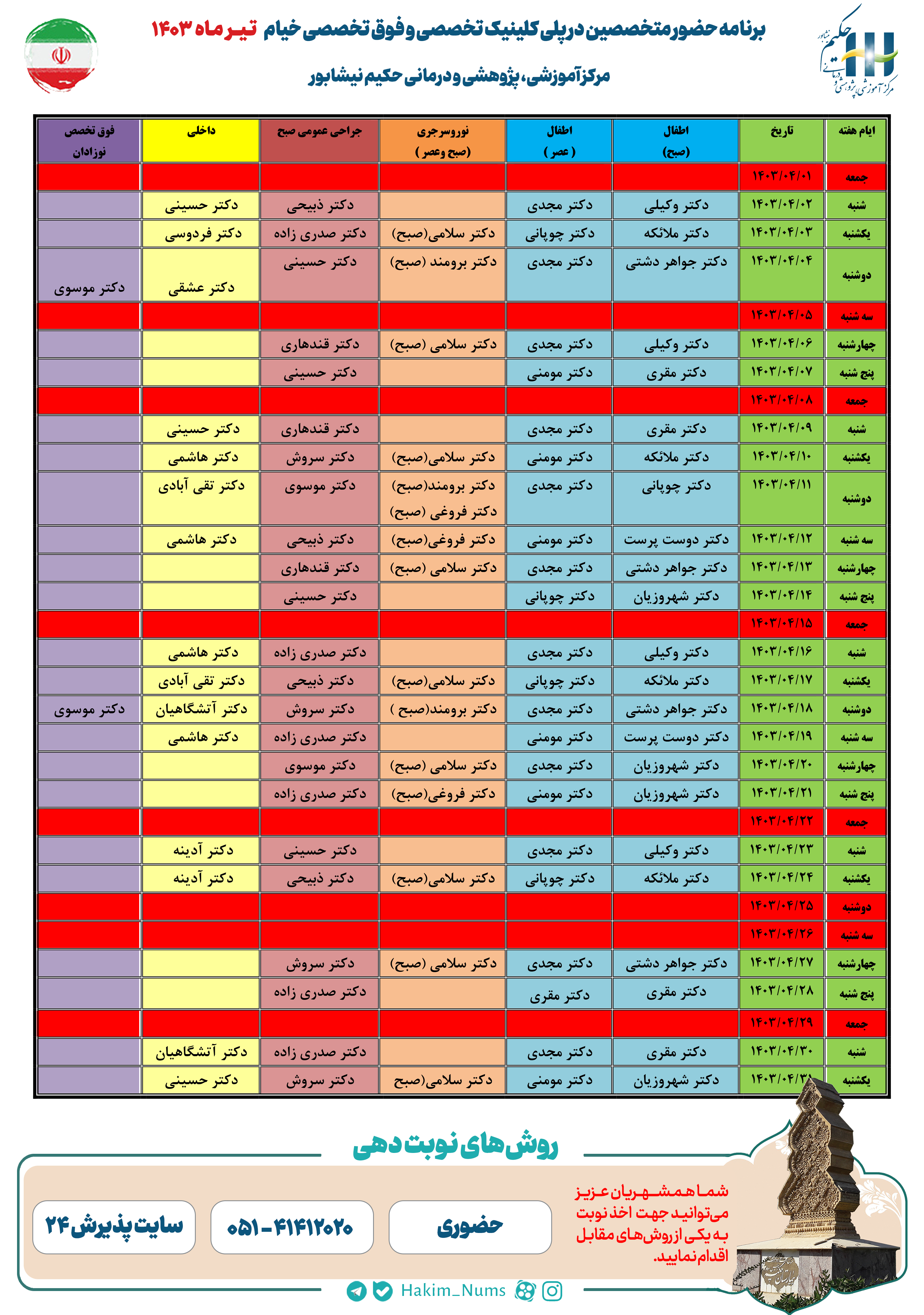 برنامه حضور متخصصین در درمانگاه تخصصی و فوق تخصصی خیام و مرکز پزشکی شمس شرق