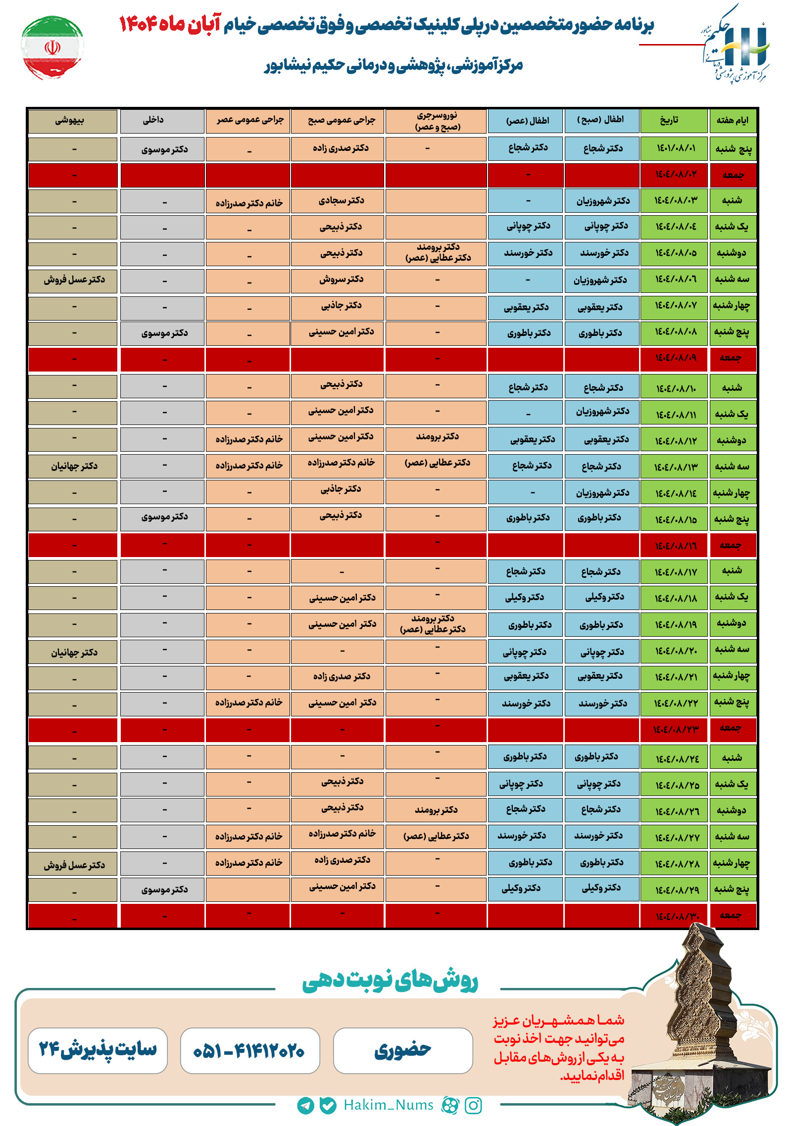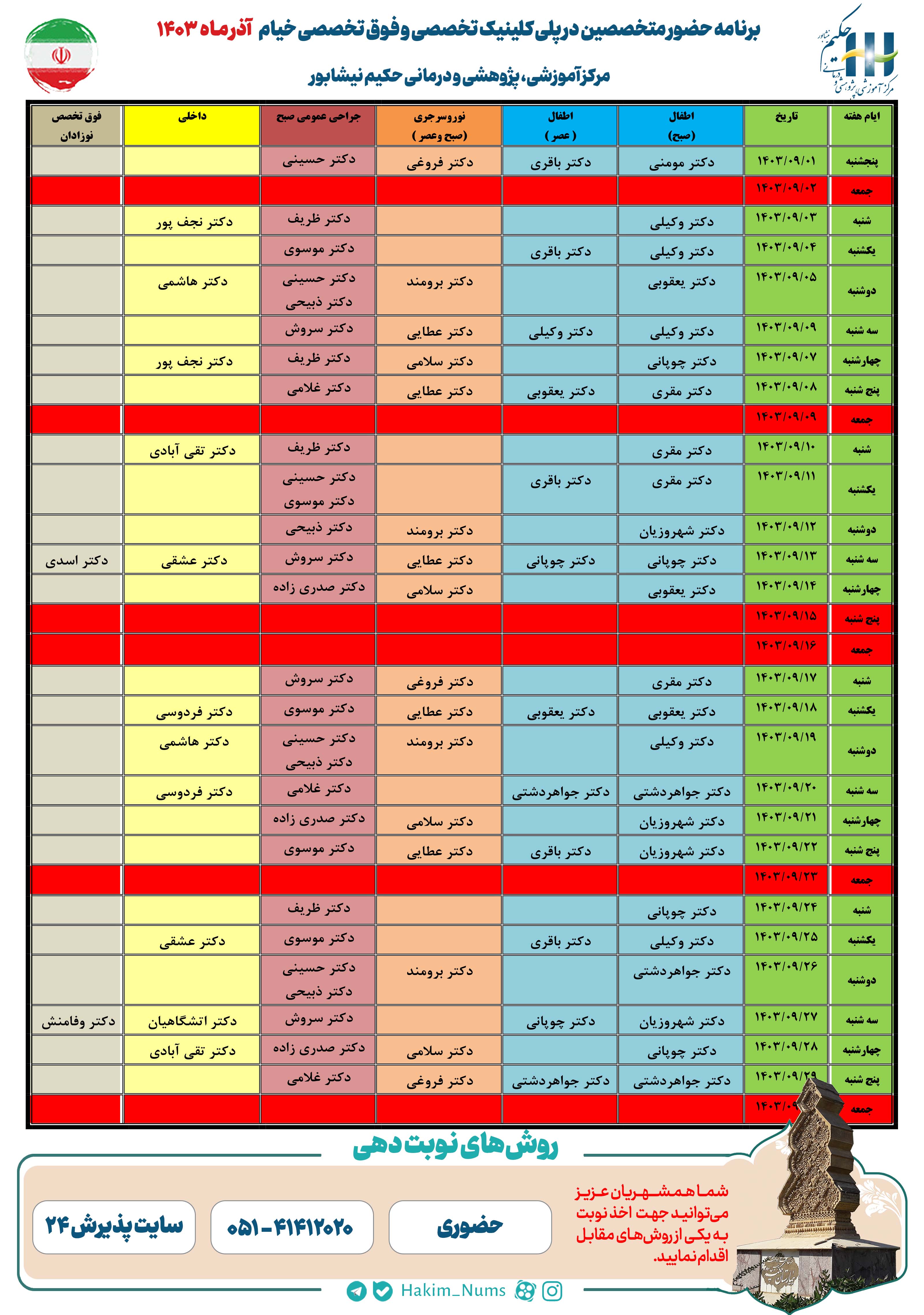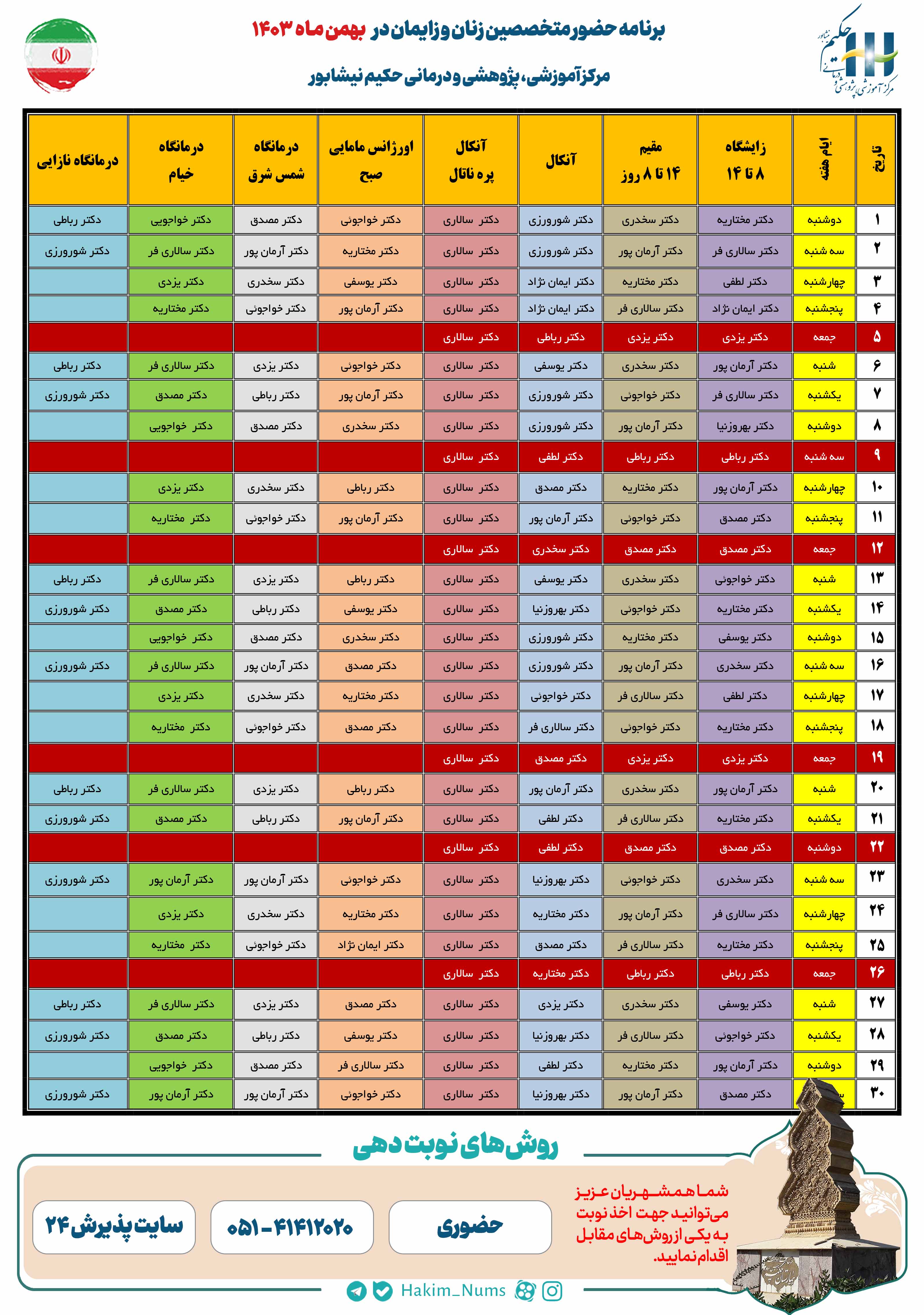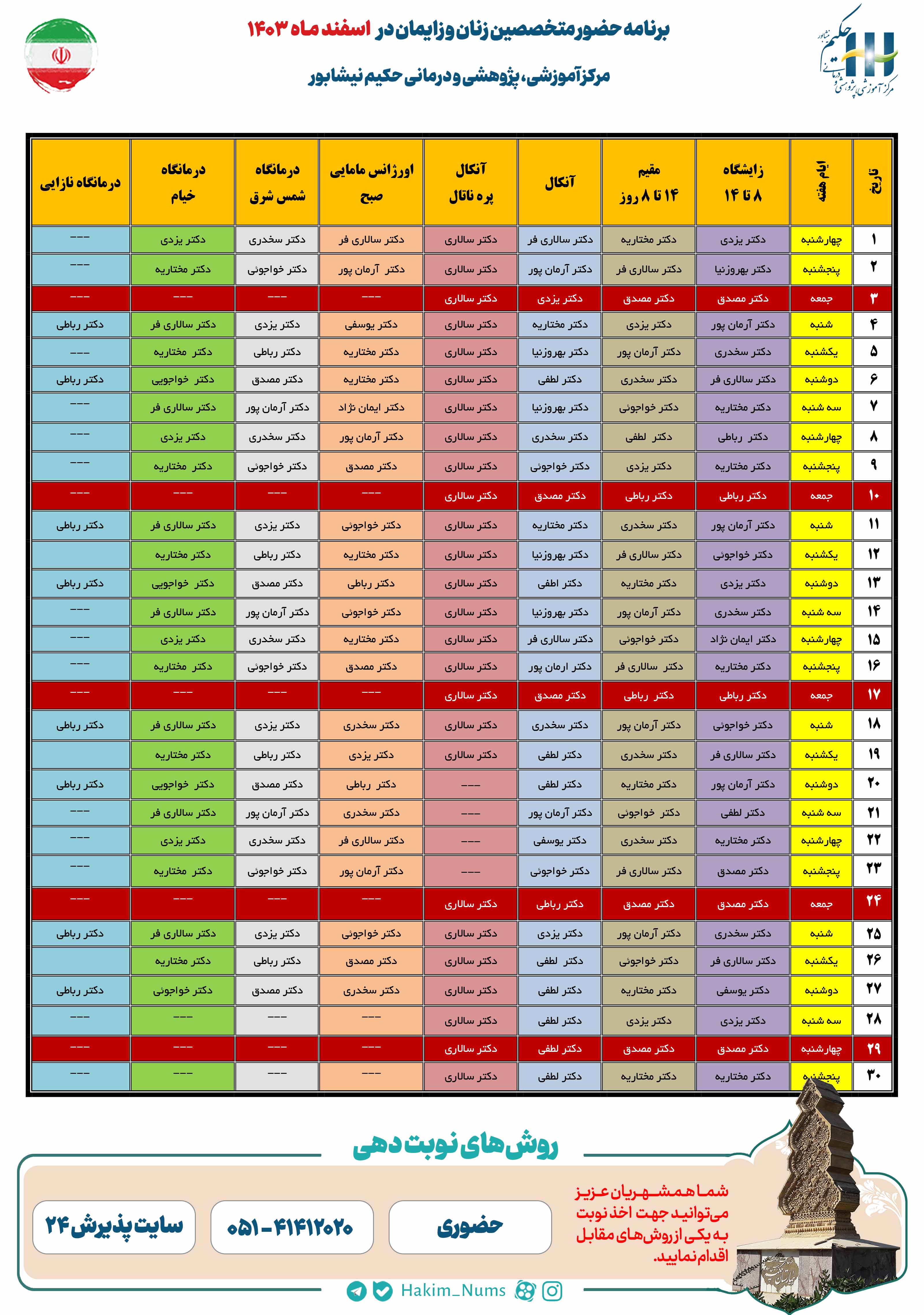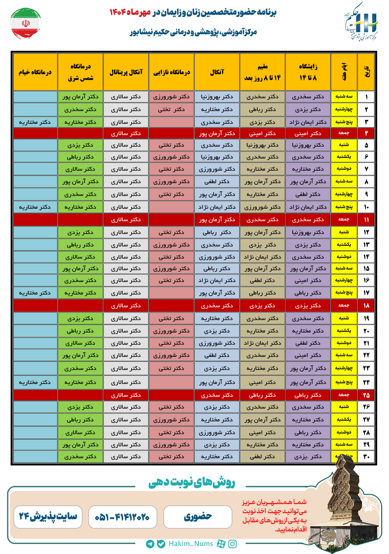 برنامه حضور متخصصین در درمانگاه تخصصی و فوق تخصصی خیام و مرکز پزشکی شمس شرق