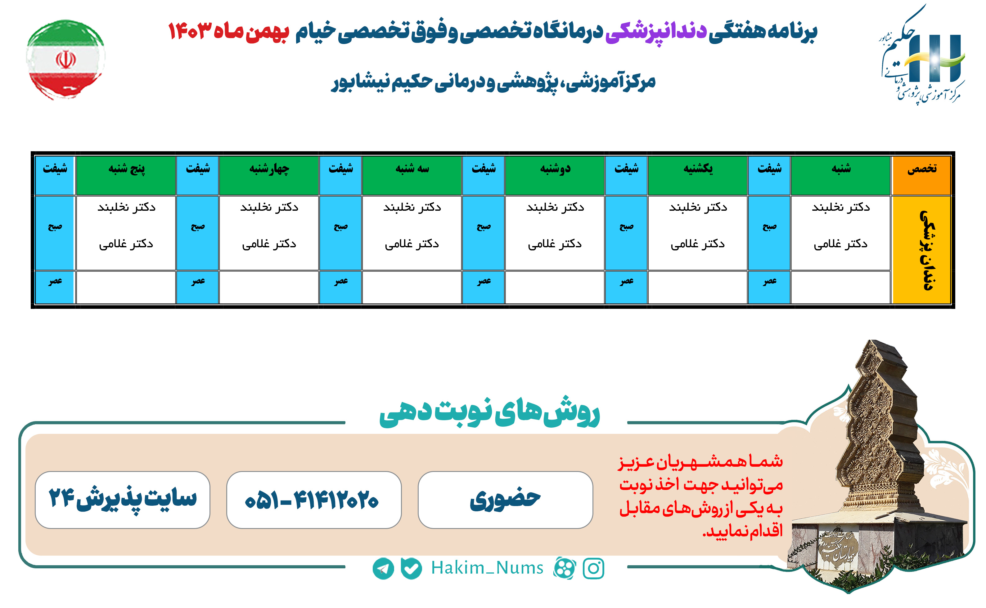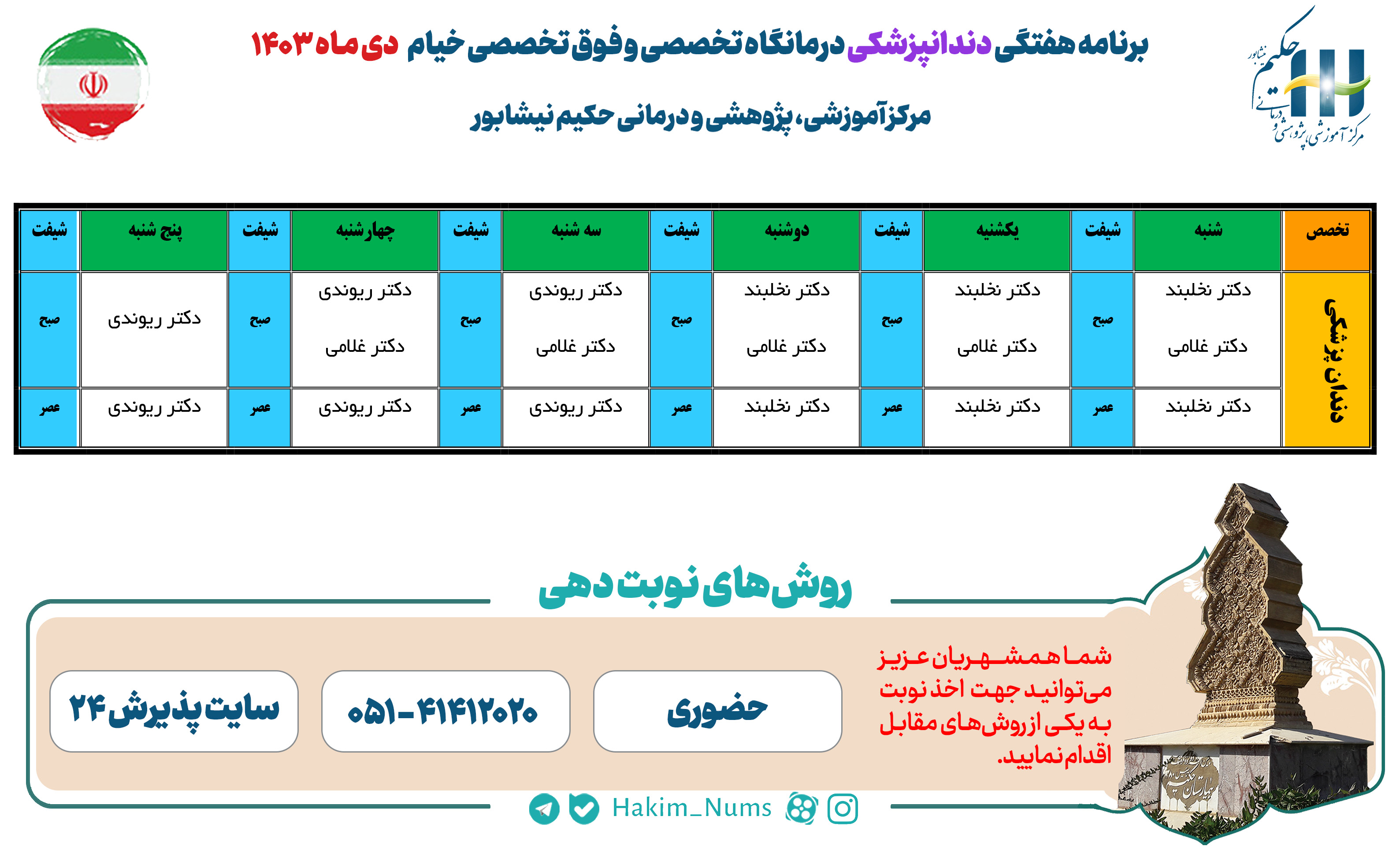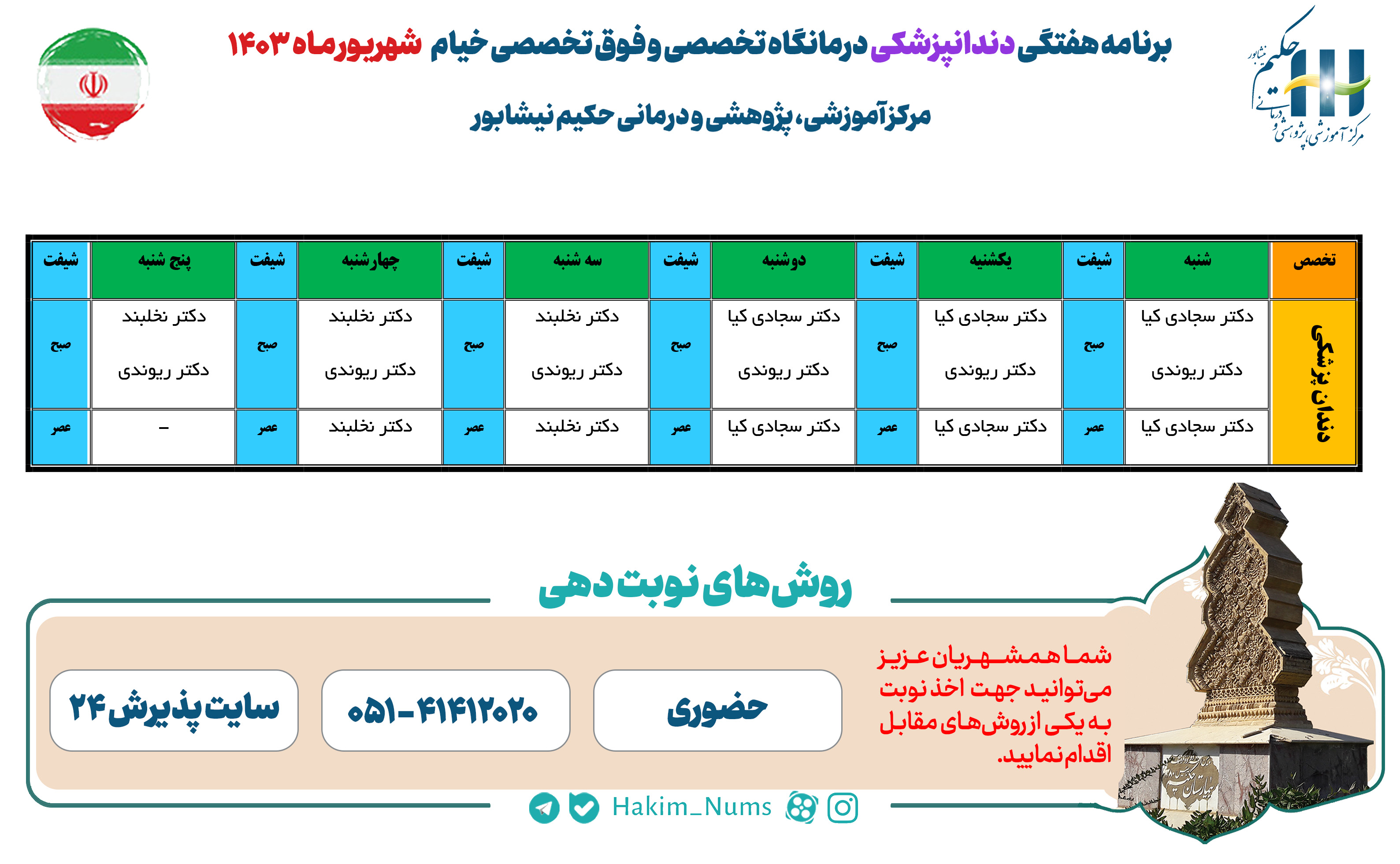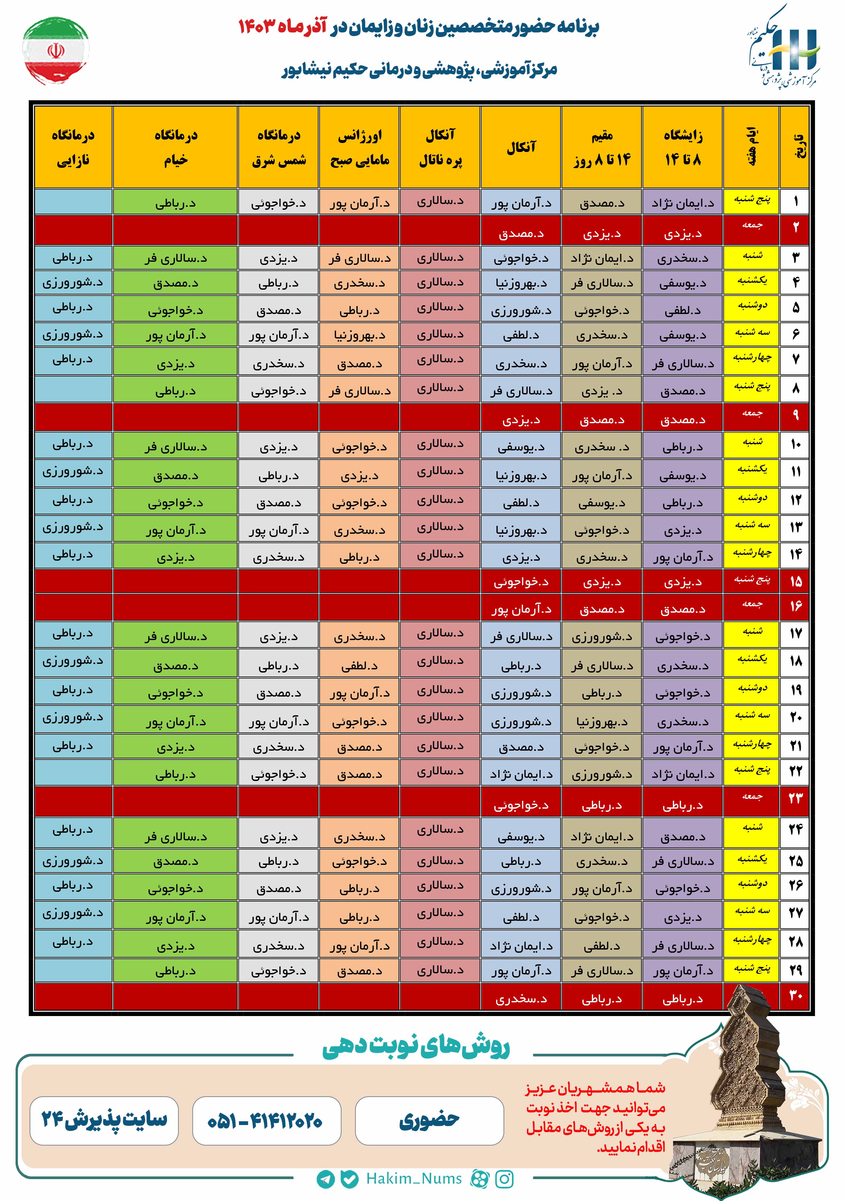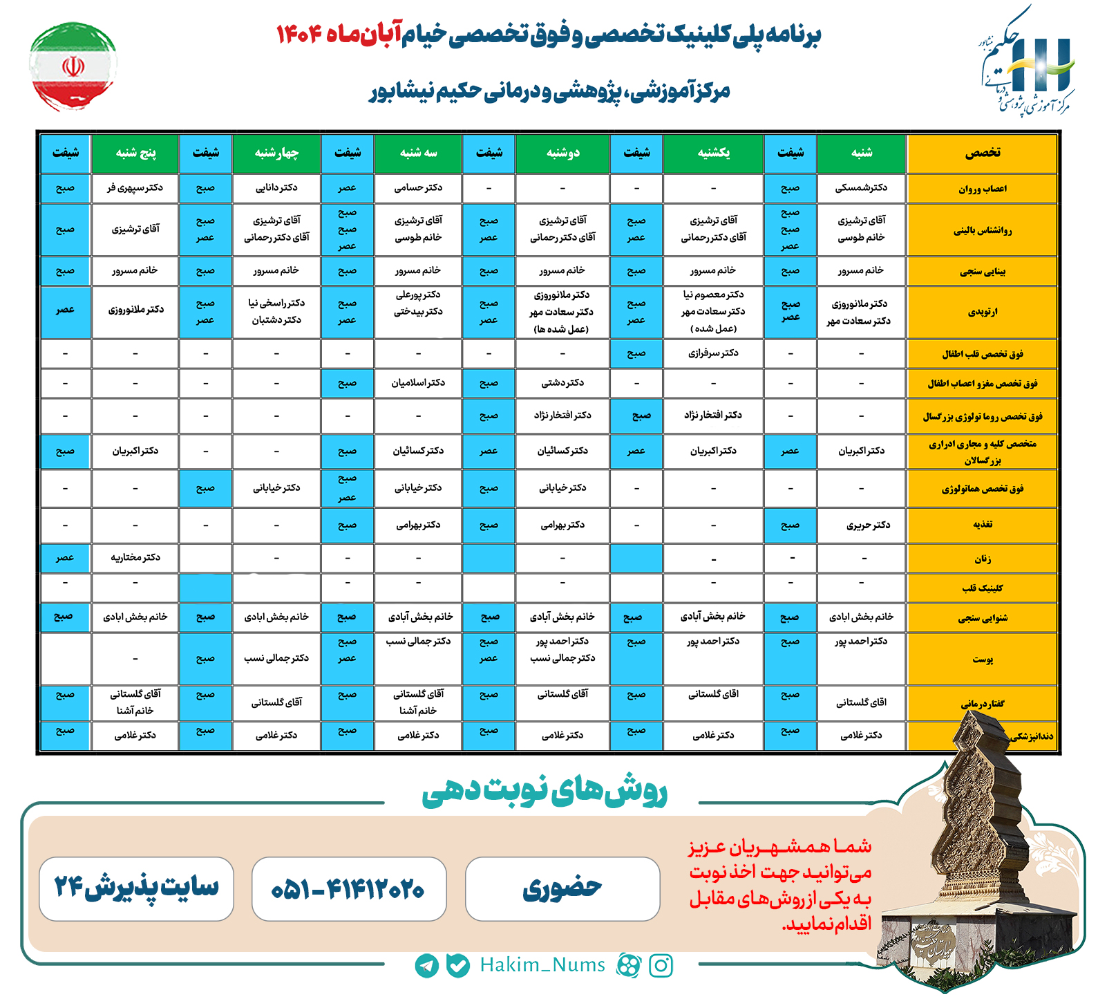 برنامه حضور متخصصین در درمانگاه تخصصی و فوق تخصصی خیام و مرکز پزشکی شمس شرق